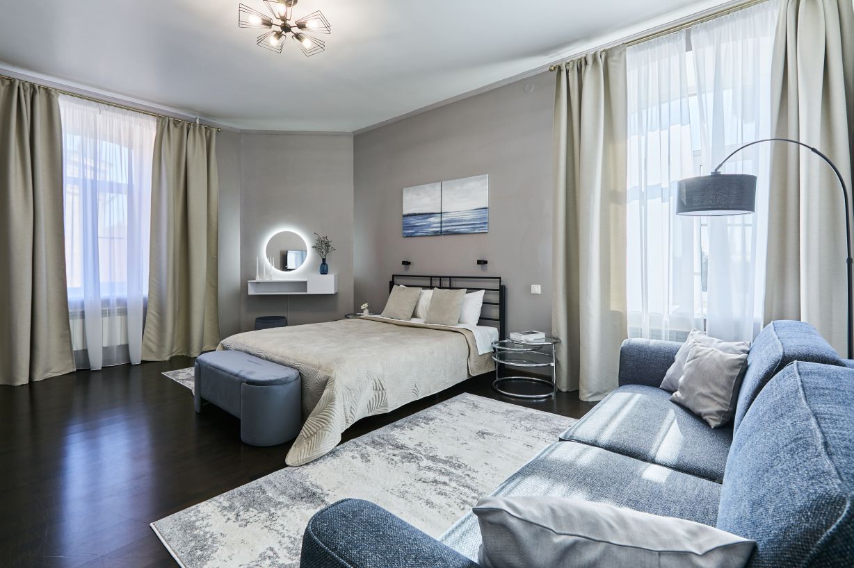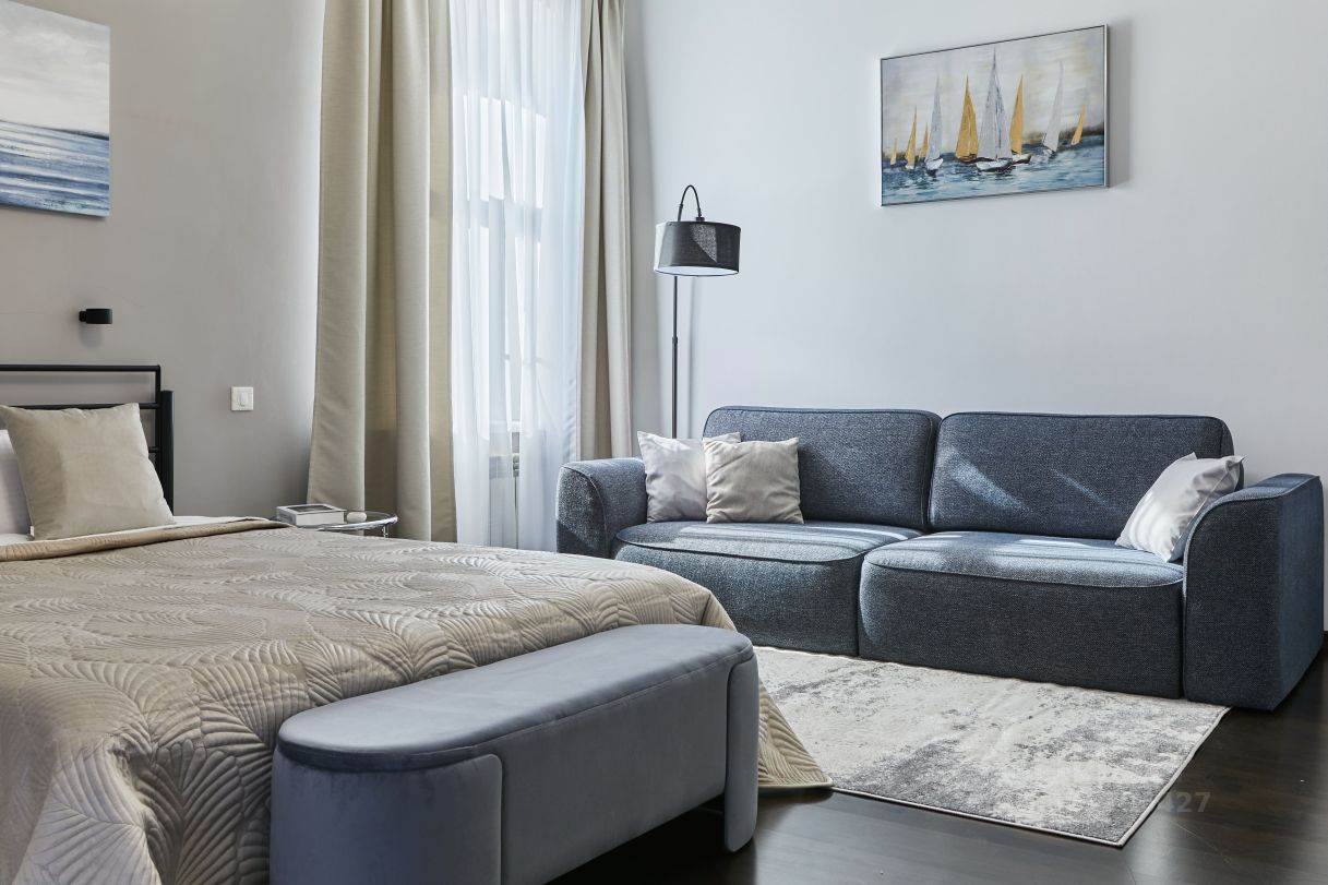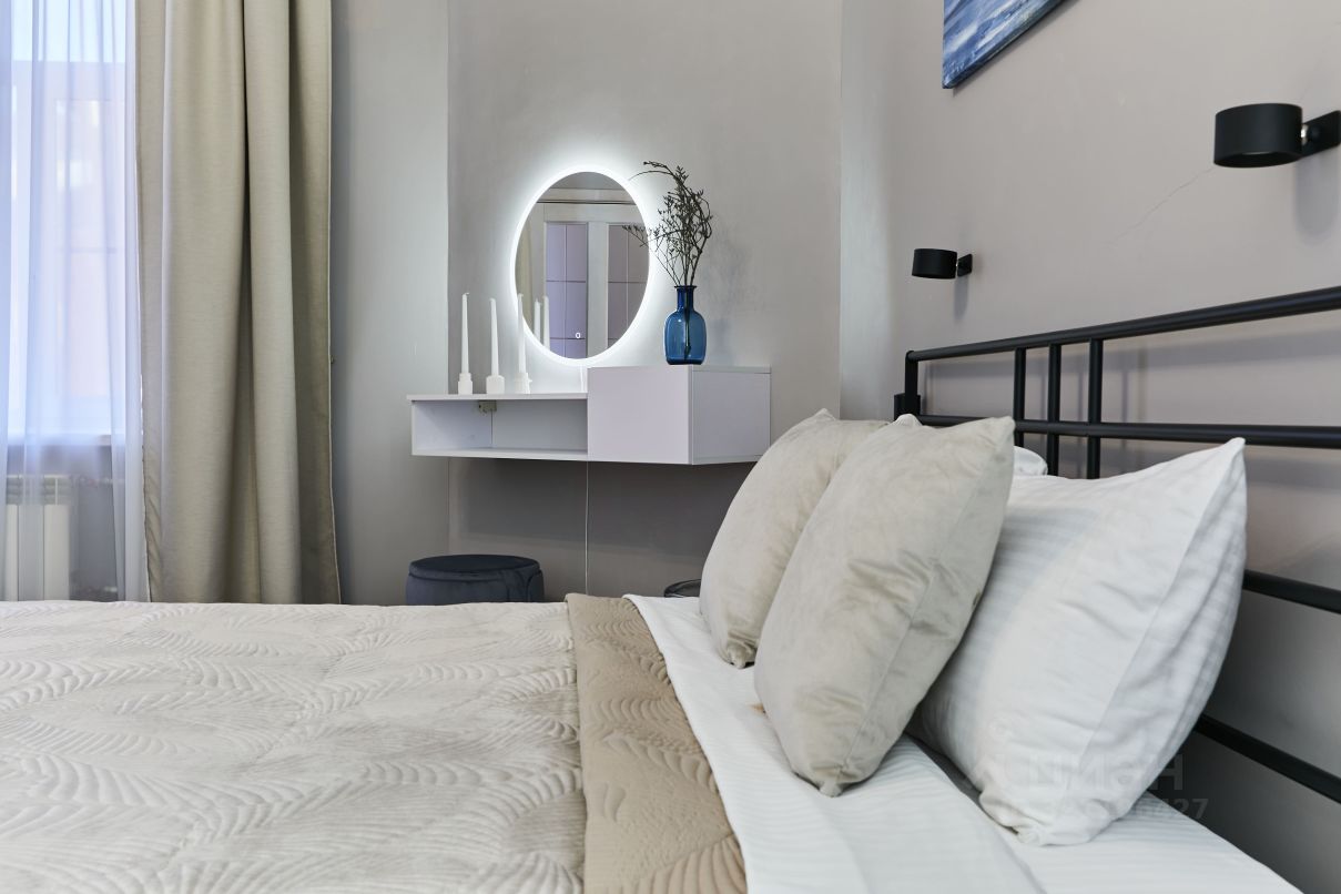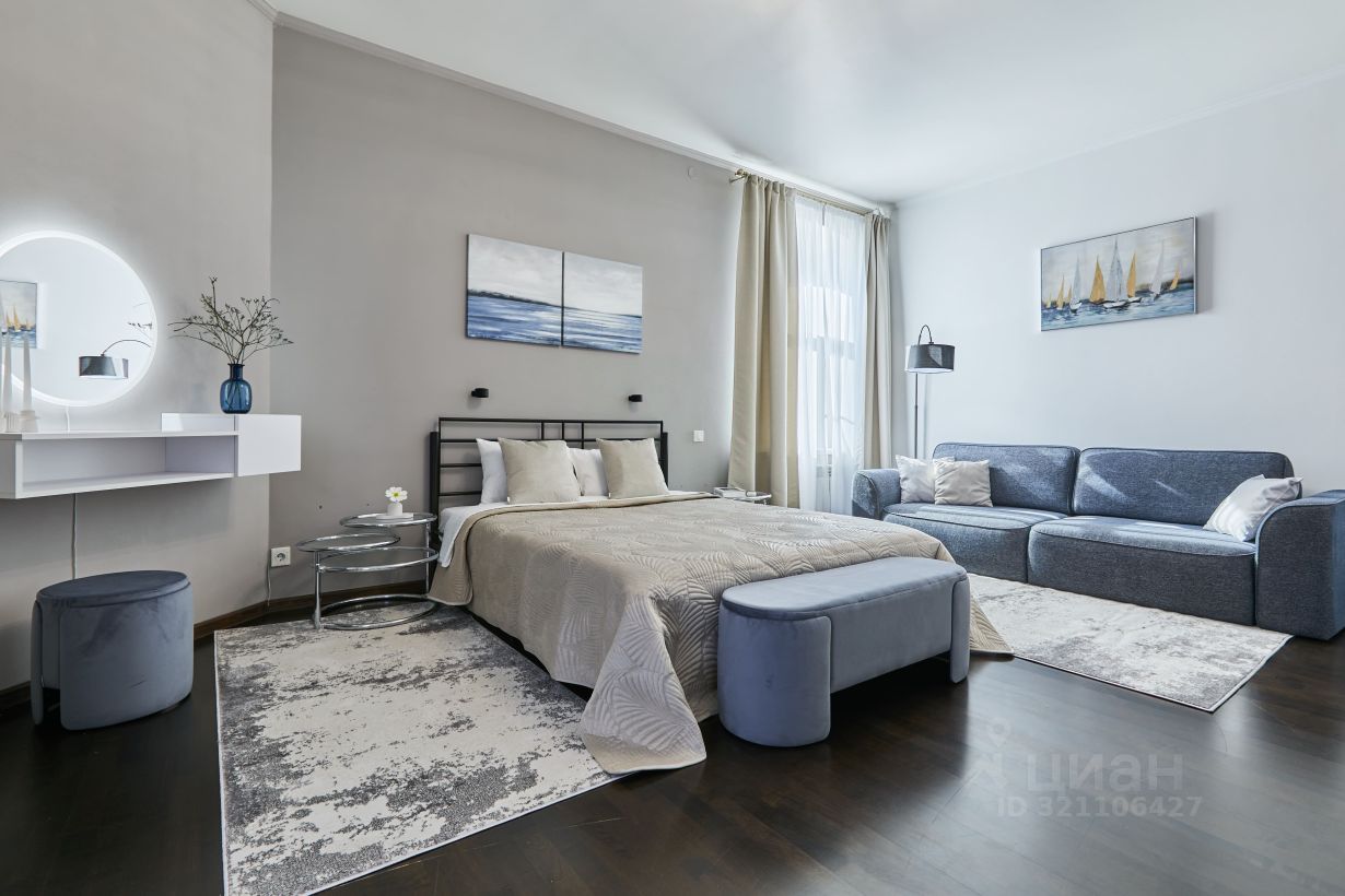 Спальня с кроватью 160/200, гардеробной, раскладным диваном, консолью с зеркалом и конечно с видом на Петропавловку и Александровский сад.