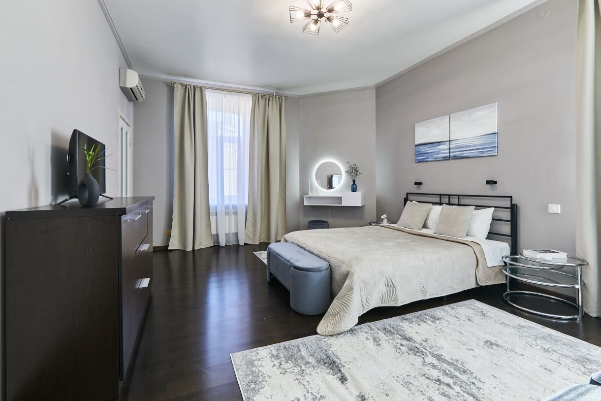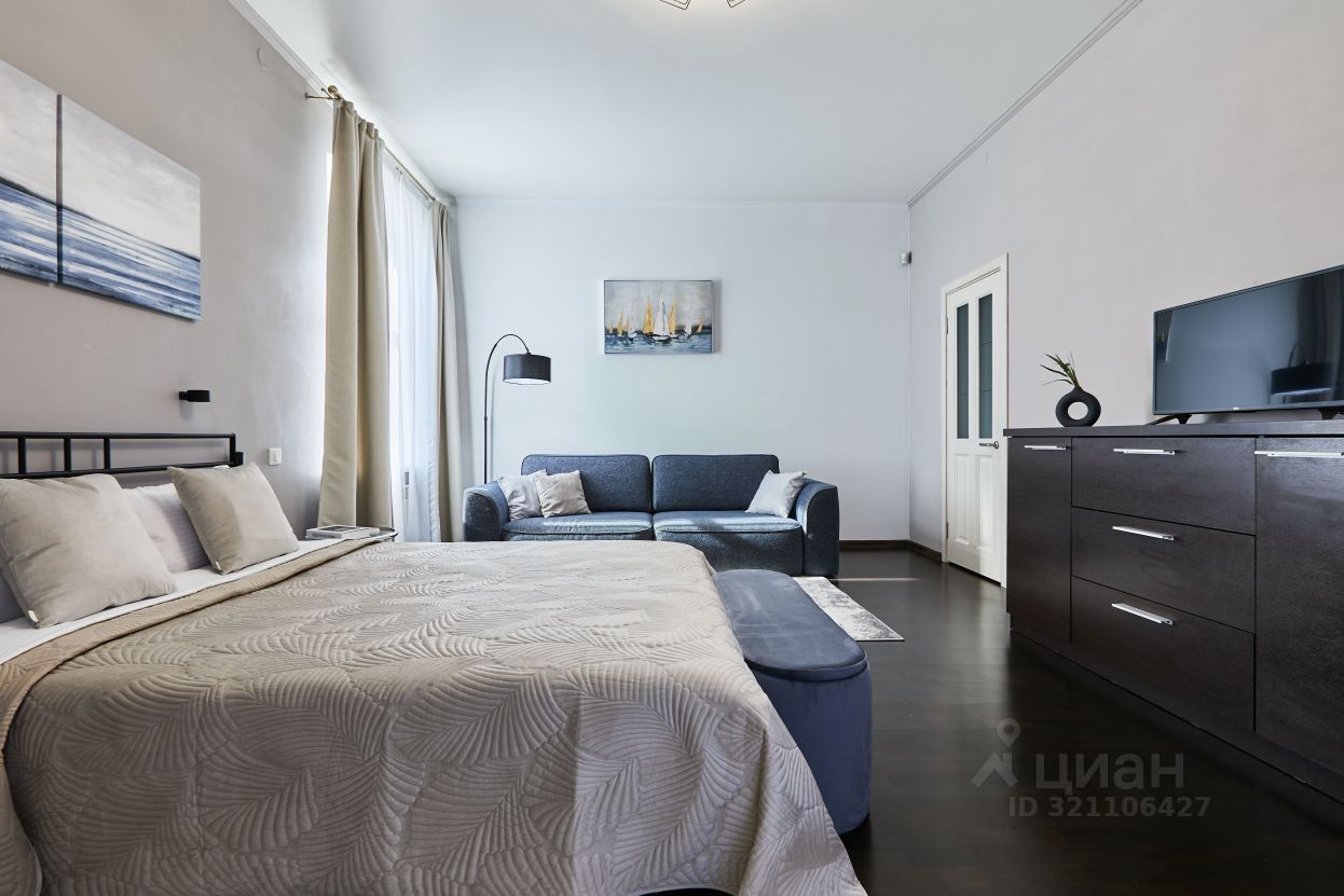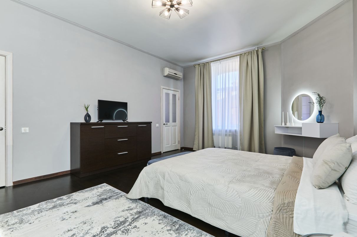 Спальня с кроватью 160/200, гардеробной, раскладным диваном, консолью с зеркалом и конечно с видом на Петропавловку и Александровский сад.