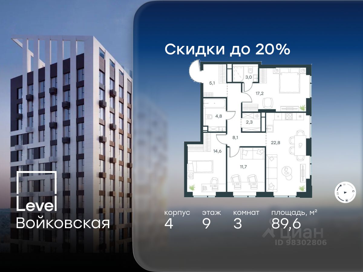 Продается 3-комнатная квартира площадью 89.60 кв. м с отделкой. Квартира находится на 9 этаже 26-этажного корпуса 4, в новом жилом комплексе бизнес-класса Level Войковская, расположенном рядом с живописным заповедником ''Покровское-Стрешнево'' (застройщик - компания Level Group/Левел групп).