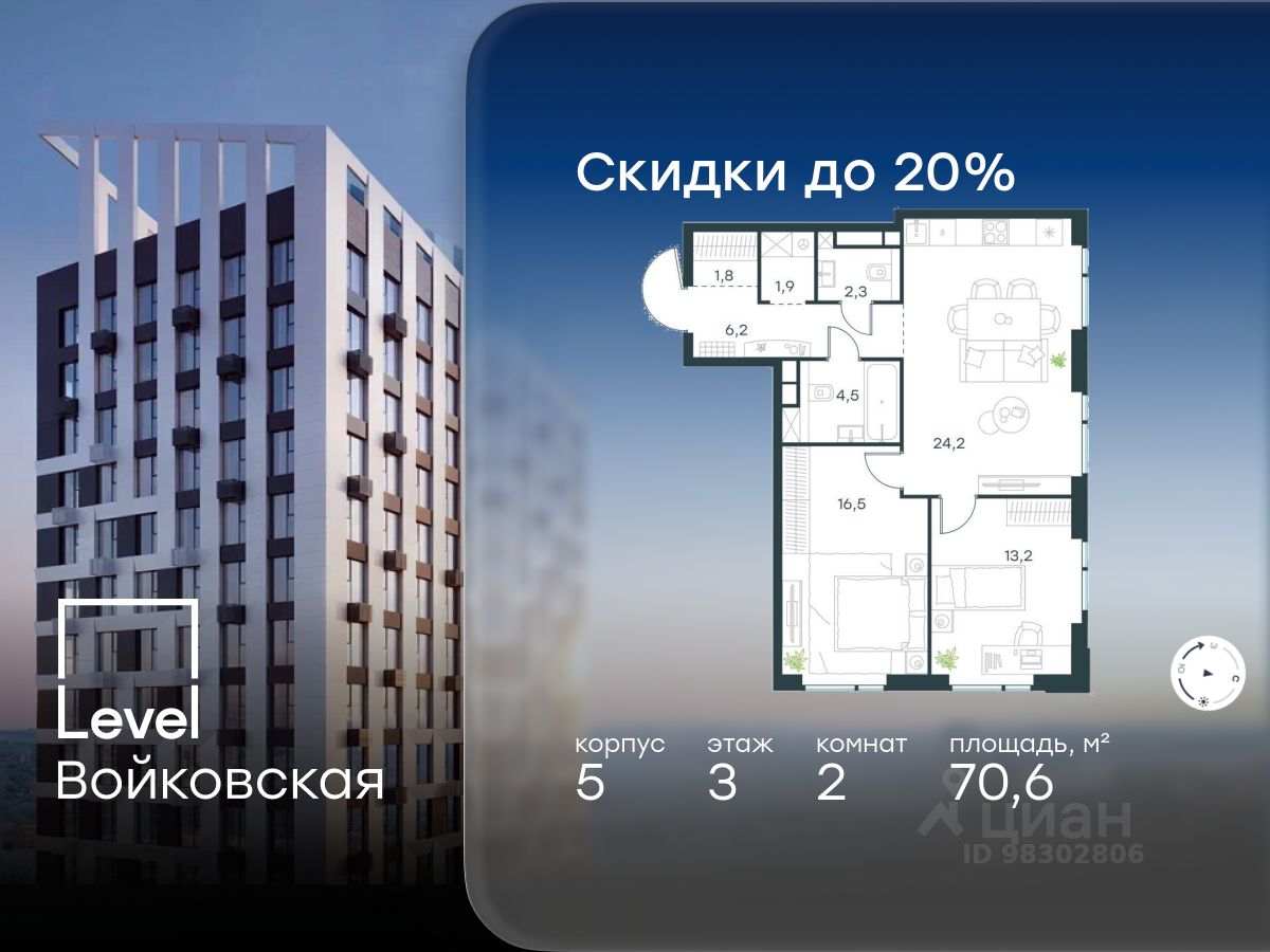 Продается 2-комнатная квартира площадью 70.60 кв. м без отделки. Квартира находится на 3 этаже 20-этажного корпуса 5, в новом жилом комплексе бизнес-класса Level Войковская, расположенном рядом с живописным заповедником ''Покровское-Стрешнево'' (застройщик - компания Level Group/Левел групп).