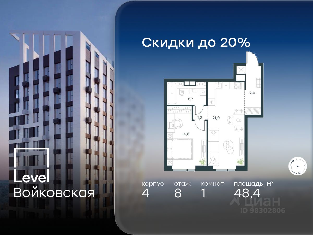 Продается 1-комнатная квартира площадью 48.40 кв. м с отделкой. Квартира находится на 8 этаже 26-этажного корпуса 4, в новом жилом комплексе бизнес-класса Level Войковская, расположенном рядом с живописным заповедником ''Покровское-Стрешнево'' (застройщик - компания Level Group/Левел групп).