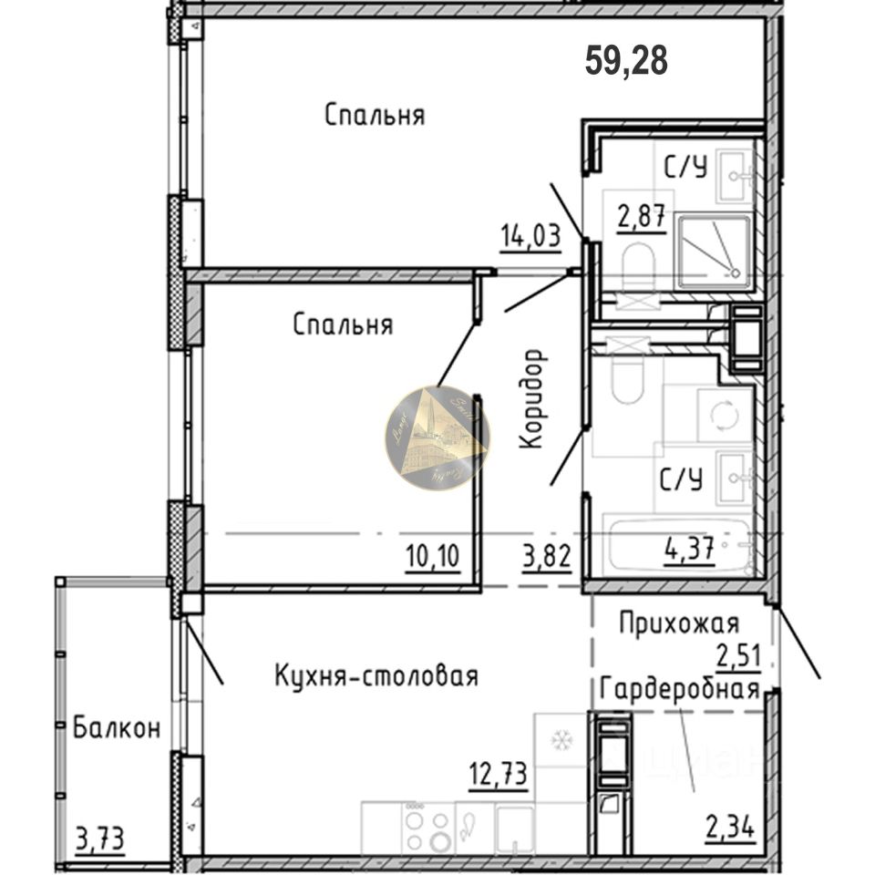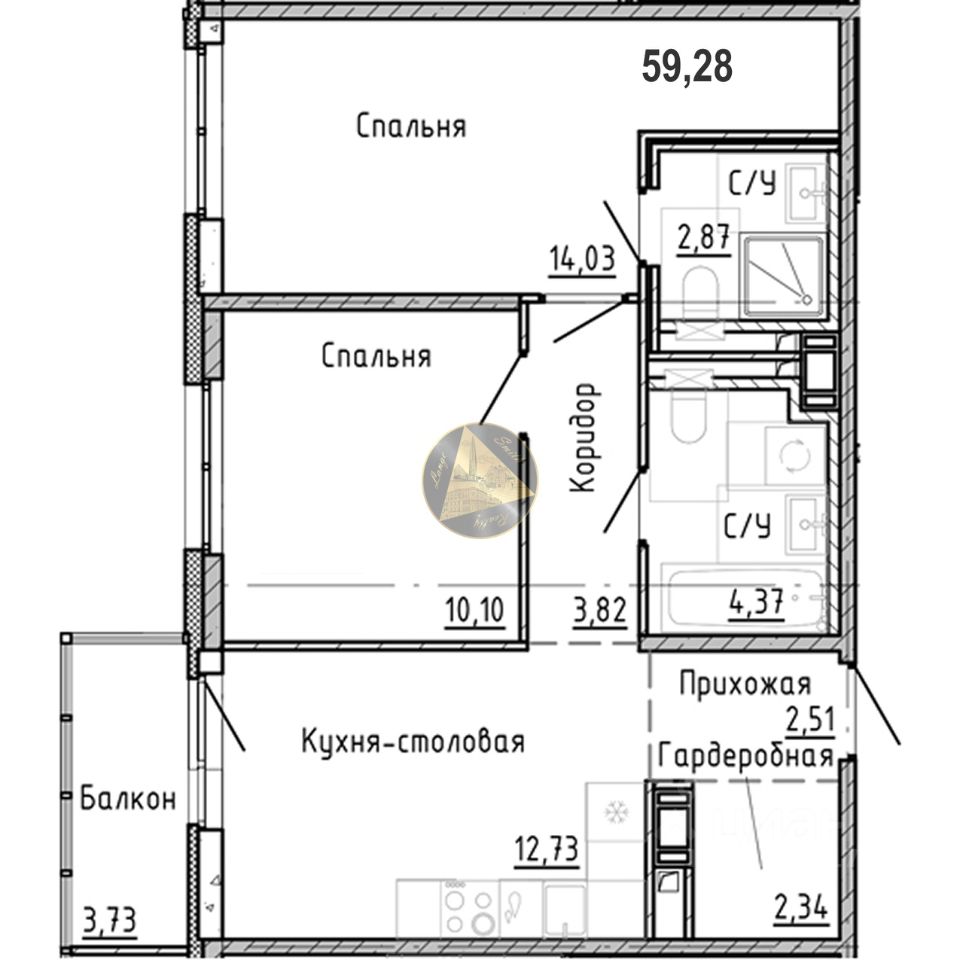 О квартире: - Квартира находится на 4 этаже 7-этажного дома - Общая площадь квартиры 59.28 м2 - Светлая спальня 14.03 м2 с отдельным санузлом 2.87 м2 - Уютная детская 10.10 м2 - Просторная кухня-гостиная 12.73 м2 - Совмещённый санузел 4.37 м2 - Гардеробная 2.34 м2 - Балкон 3.73 м2