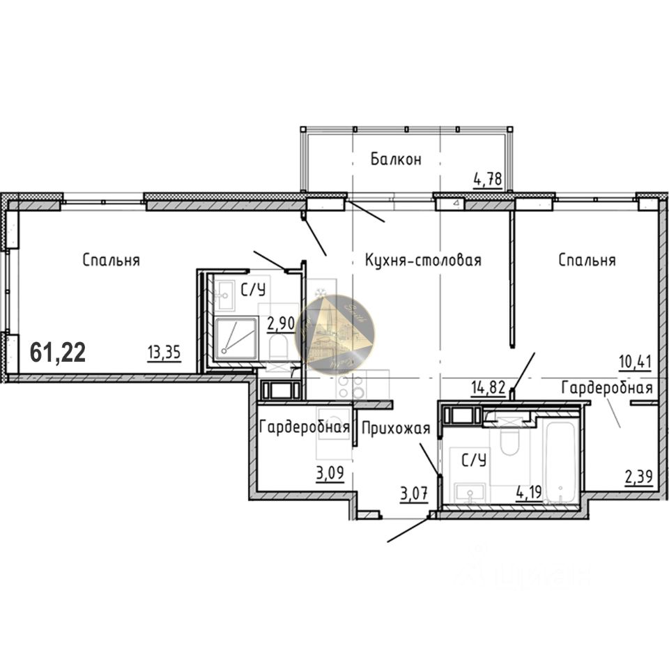 О квартире: - Квартира находится на 5 этаже 7-этажного дома - Общая площадь квартиры 61.22 м2 - Светлая спальня 13.35 м2 с отдельным санузлом 2.90 м2 - Уютная детская 10.41 м2 с гардеробной 2.39 м2 - Просторная кухня-гостиная 14.82 м2 - Совмещённый санузел 4.19 м2 - Гардеробная 3.09 м2 - Балкон 4.78 м2