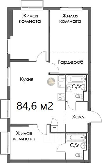 О квартире: - Квартира находится на 11 этаже 12-этажного дома - Общая площадь квартиры 84,6 м2 - Уютная спальня 12,9 м2 - Детская комната 12,2 м2 - Гостевая комната 11,3 м2 - Просторная кухня-гостиная 23,1 м2 - Раздельный санузел 3,5 м2 + 3,5 м2 - Гардеробная комната 5,8 м2