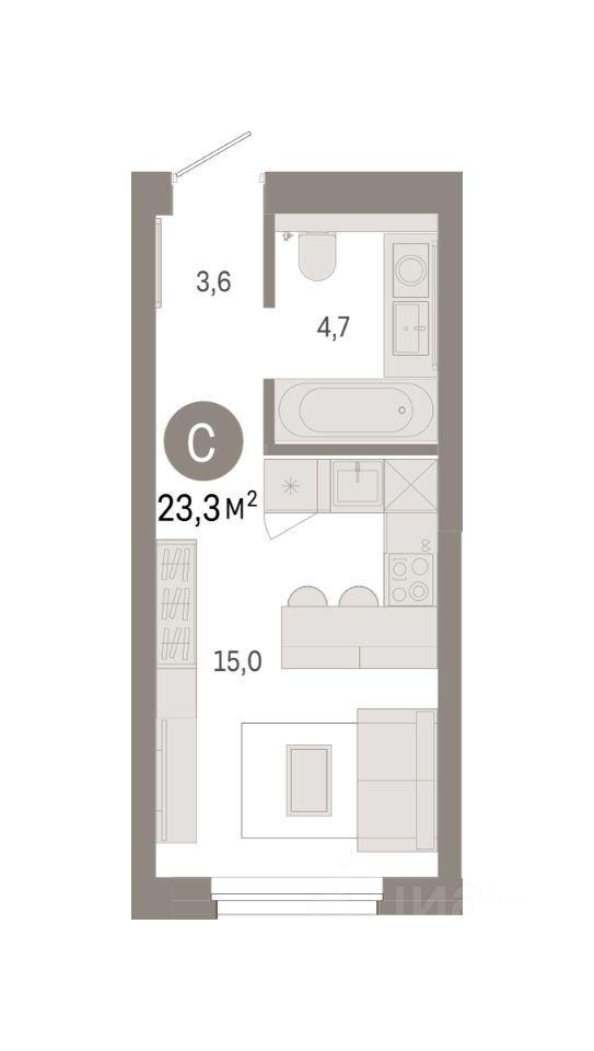 Студия в проекте Город-на-озере. Особенности планировки: предчистовая отделка. квартиры в нашей базе: ГРД01-Ж1.6.3.