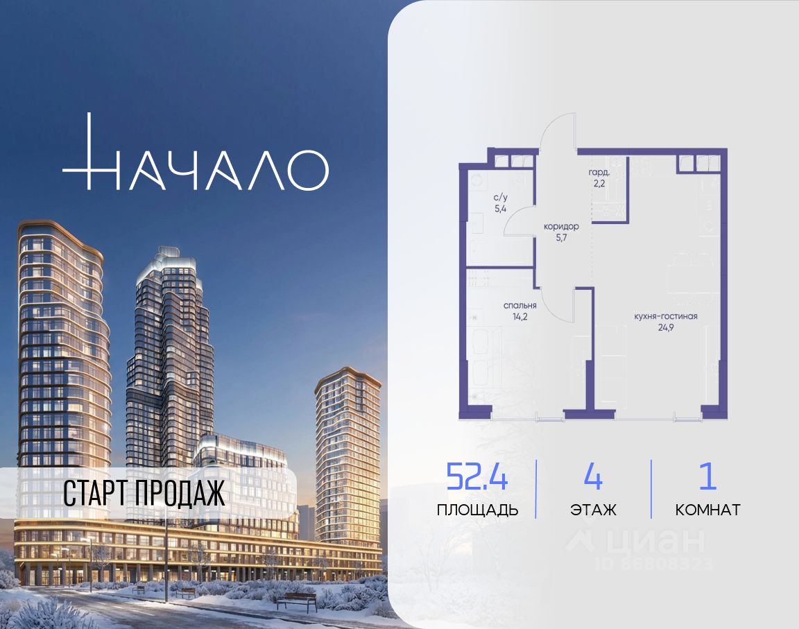 В престижном районе Пресня, на перекрестке делового и исторического центров Москвы, продается однокомнатная квартира площадью 52.40 кв. м без отделки. Квартира находится на 4 этаже 11-этажного дома, в новом элитном жилом комплексе ''Начало'' от девелопера ''Донстрой''. Реализация проекта запланирована на 1 квартал 2030 года.
