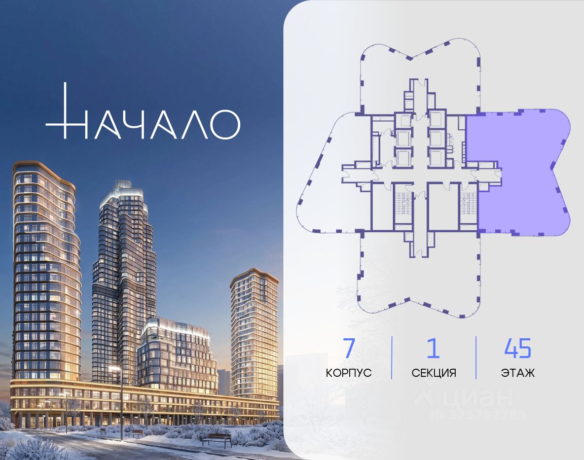 В престижном районе Пресня, на перекрестке делового и исторического центров Москвы, продается четырехкомнатная квартира площадью 243.00 кв. м без отделки. Квартира находится на 45 этаже 48-этажного дома, в новом элитном жилом комплексе ''Начало'' от девелопера ''Донстрой''. Реализация проекта запланирована на 1 квартал 2030 года.