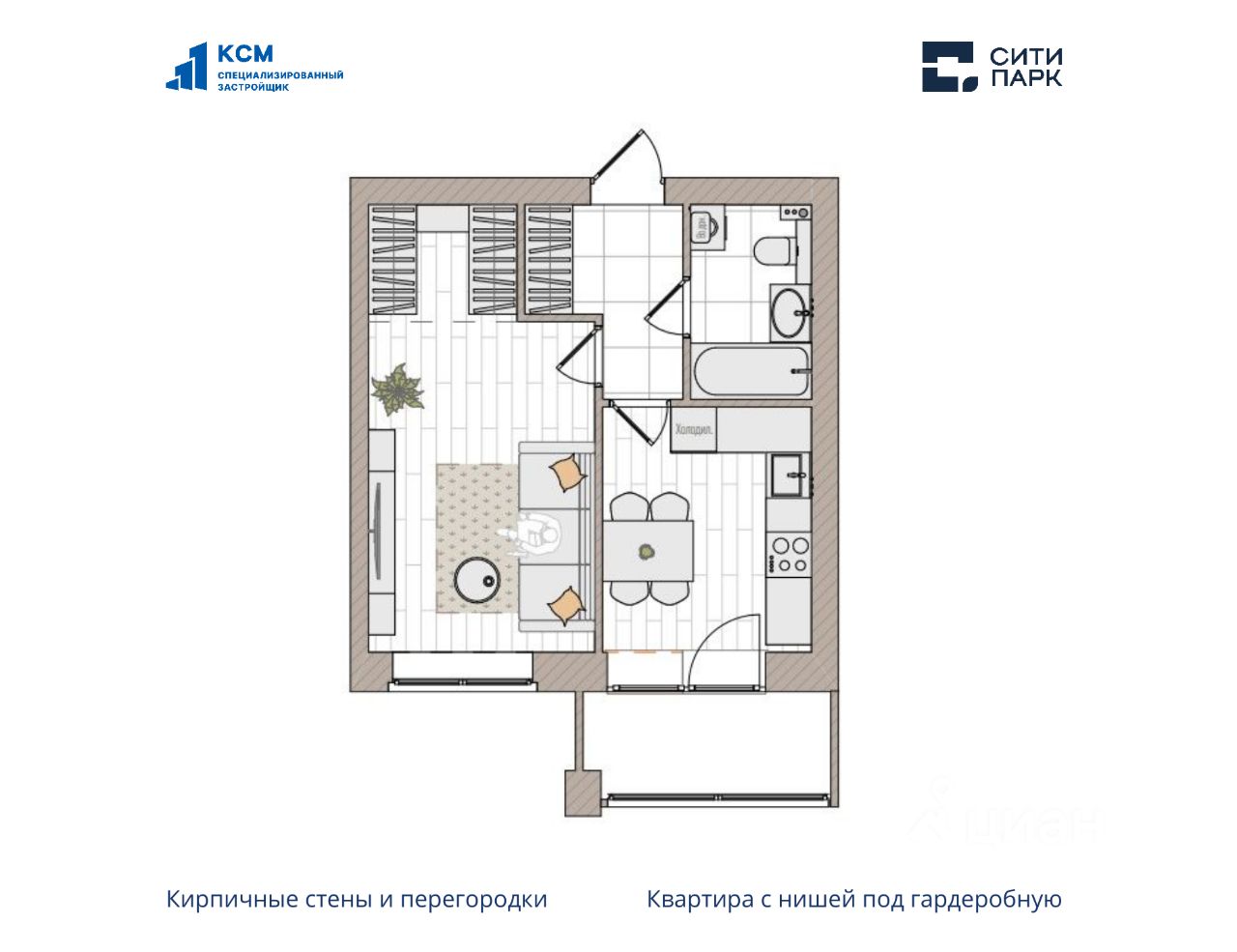 1-комнатная, 37.2 м², 37 по адресу Парковая, 1б Тип дома: Кирпич. Жилой комплекс ''Сити Парк''Преимущества покупки квартиры в новостройке напрямую от застройщика КСМ: