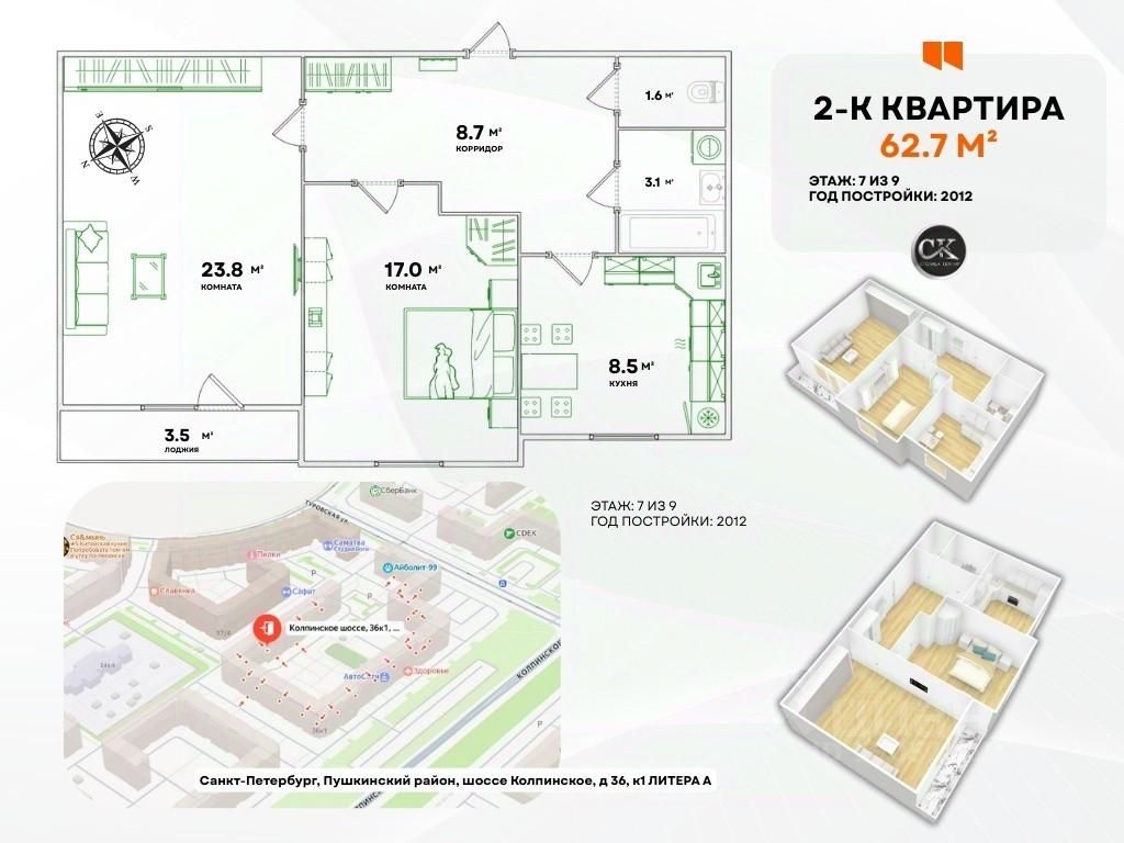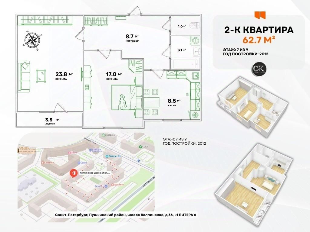 Продается 2-комнатная квартира 62.7 м² | шоссе Колпинское, 36, к.1, лит. А | Пушкинский район, СПб