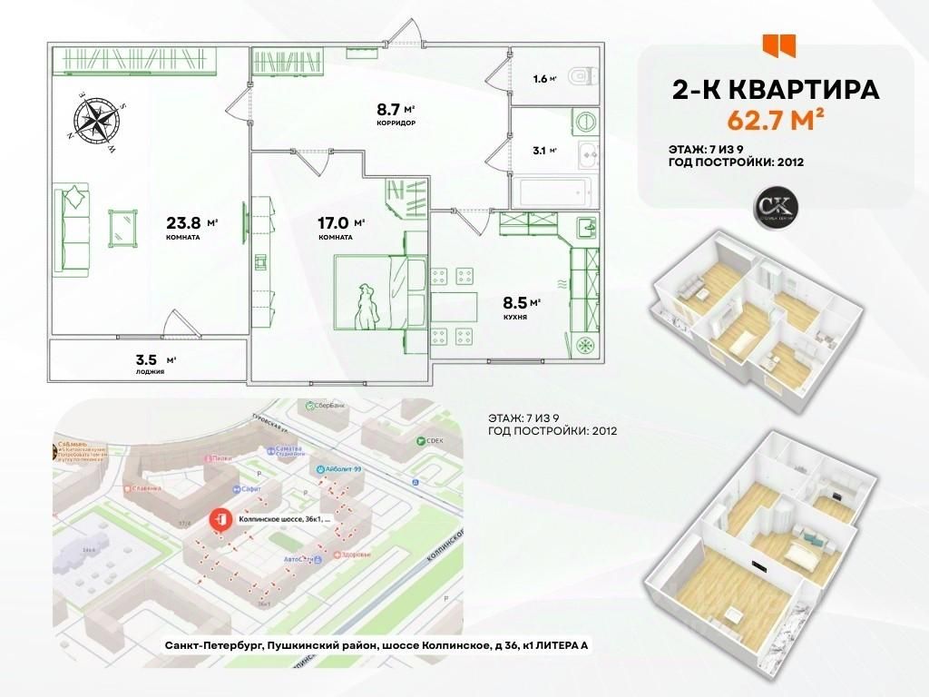 Общая площадь: 62.7 м² | Жилая: 40.8 м² (17.0 + 23.8 м²) Кухня: 8.5 м² | Коридор: 8.7 м² | Ванна: 3.1 м² | Туалет: 1.6 м² Этаж: 7 из 9 | Год постройки: 2012 г. Лоджия: 3.5 м², застеклённая.