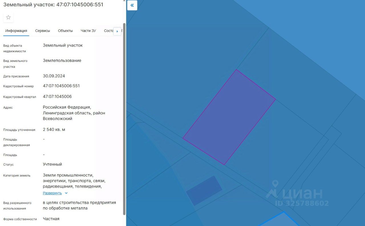 В промышленной зоне Ковалево, расположенной в 5 км от Рябовского шоссе, г. Санкт-Петербург, продаётся земельный участок площадью 2540 кв. м.