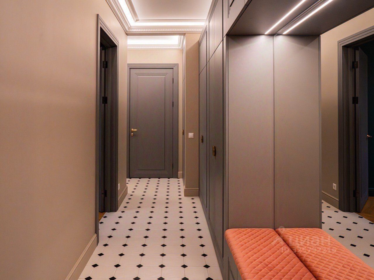 Дизайн выполнен в классическом петербургском стиле с мягким подсветкой потолков и изысканными натяжными потолками. Окна выходят на ухоженный зеленый двор, создавая атмосферу уюта и спокойствия.