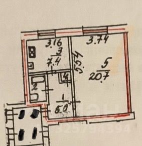 Комната 20,7 м2, кухня -7,4 м2, коридор -5 м2, санузел -2,4 м2.