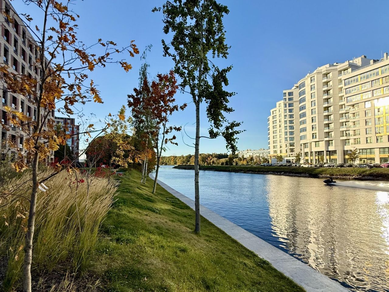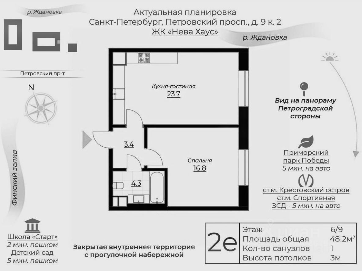 В ЖК закрытая от посторонних территория с собственной набережной, пирс, детские площадки с современным оборудованием, ресторан Лодочная станция для встречи закатов у воды, рядом школа, кофейни, салоны, винные лавки, магазины, аптеки и все самое необходимое. В пешей доступности Петровский парк, благоустроенный сад им. Савиной, популярные Приморский парк Победы и Елагин остров. Также в ближайшем окружении спортивные объекты, а до центра города всего 5 минут на авто. До аэропорта Пулково 20 минут езды.