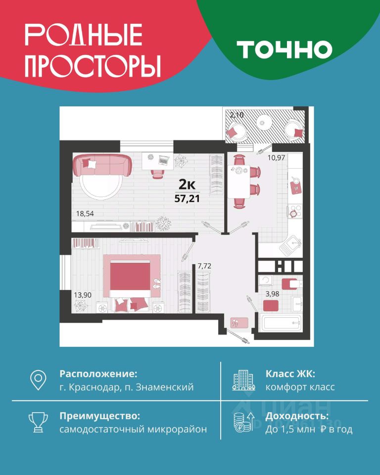 ''Родные просторы''- самодостаточный микрорайон, который реализован по принципу комплексного развития территории, где есть вся инфраструктура для комфортной жизни. На территории 41 га 29 домов от 9 до 24 этажей, уютные дворы со спортивными и игровыми площадками, социальные и коммерческие объекты, зеленые массивы и фонтаны. Главная точка притяжения ''Родных просторов'' - парк семейного отдыха площадью 9 га, 4,5 км прогулочных аллей, амфитеатр для мероприятий, кинофестивальная площадка. Особая гордость микрорайона современная школа на 1550 мест и 3 детских сада ''Ладушки'', ''Веснушки'' и ''Топотушки'' на 880 малышей. В центре микрорайона строятся фитнес-клуб BALANCE с акватермальным комплексом и собственная поликлиника, площадью более 5000 кв.м.