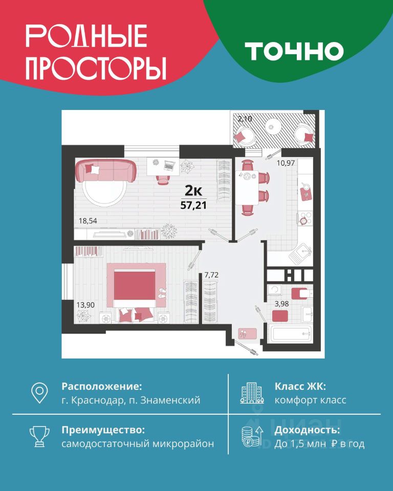 ''Родные просторы''- самодостаточный микрорайон, который реализован по принципу комплексного развития территории, где есть вся инфраструктура для комфортной жизни. На территории 41 га 29 домов от 9 до 24 этажей, уютные дворы со спортивными и игровыми площадками, социальные и коммерческие объекты, зеленые массивы и фонтаны. Главная точка притяжения ''Родных просторов'' - парк семейного отдыха площадью 9 га, 4,5 км прогулочных аллей, амфитеатр для мероприятий, кинофестивальная площадка. Особая гордость микрорайона современная школа на 1550 мест и 3 детских сада ''Ладушки'', ''Веснушки'' и ''Топотушки'' на 880 малышей. В центре микрорайона строятся фитнес-клуб BALANCE с акватермальным комплексом и собственная поликлиника, площадью более 5000 кв.м.