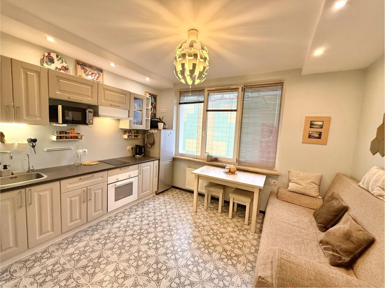 - кухня оборудована гарнитуром со встроенной бытовой техникой, дополнительными местами хранения, диваном,