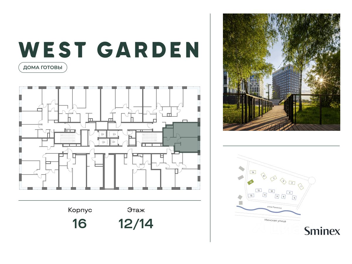 West Garden - это собрание клубных домов высотой 12-14 этажей в собственном парке 16 гектаров вдоль реки. Просторный среднеэтажный квартал расположен на Минской улице, в респектабельном Западном округе столицы. Вокруг премиальное окружение и более 1000 гектаров парков.