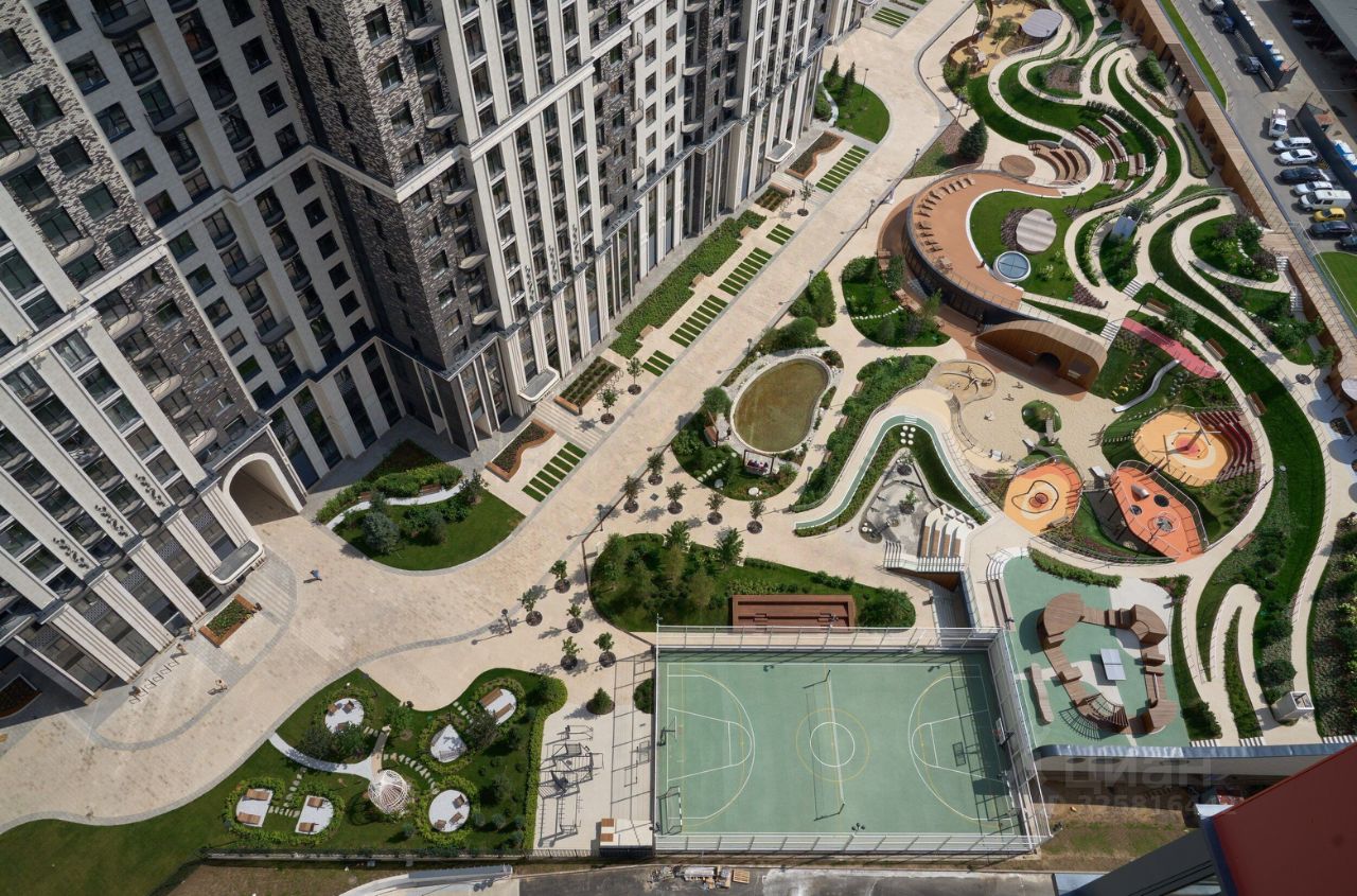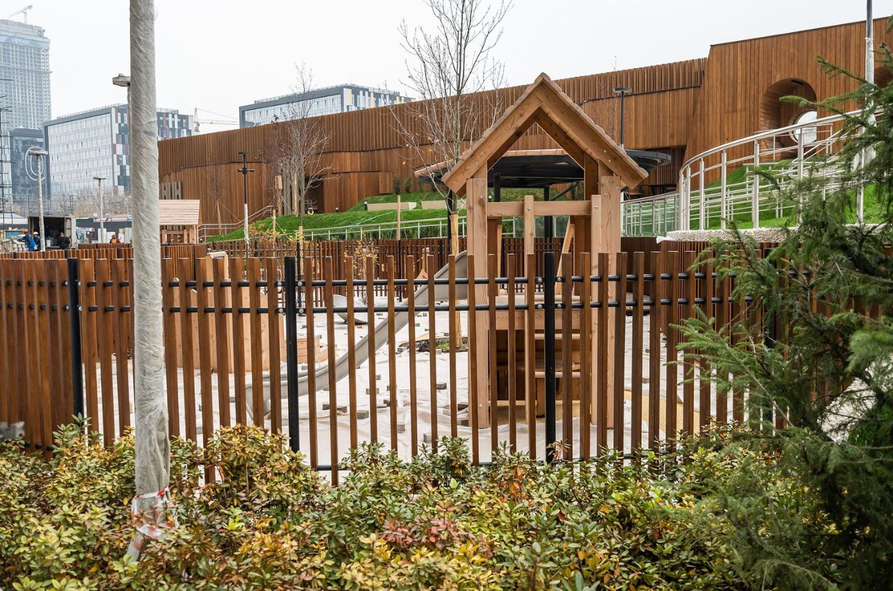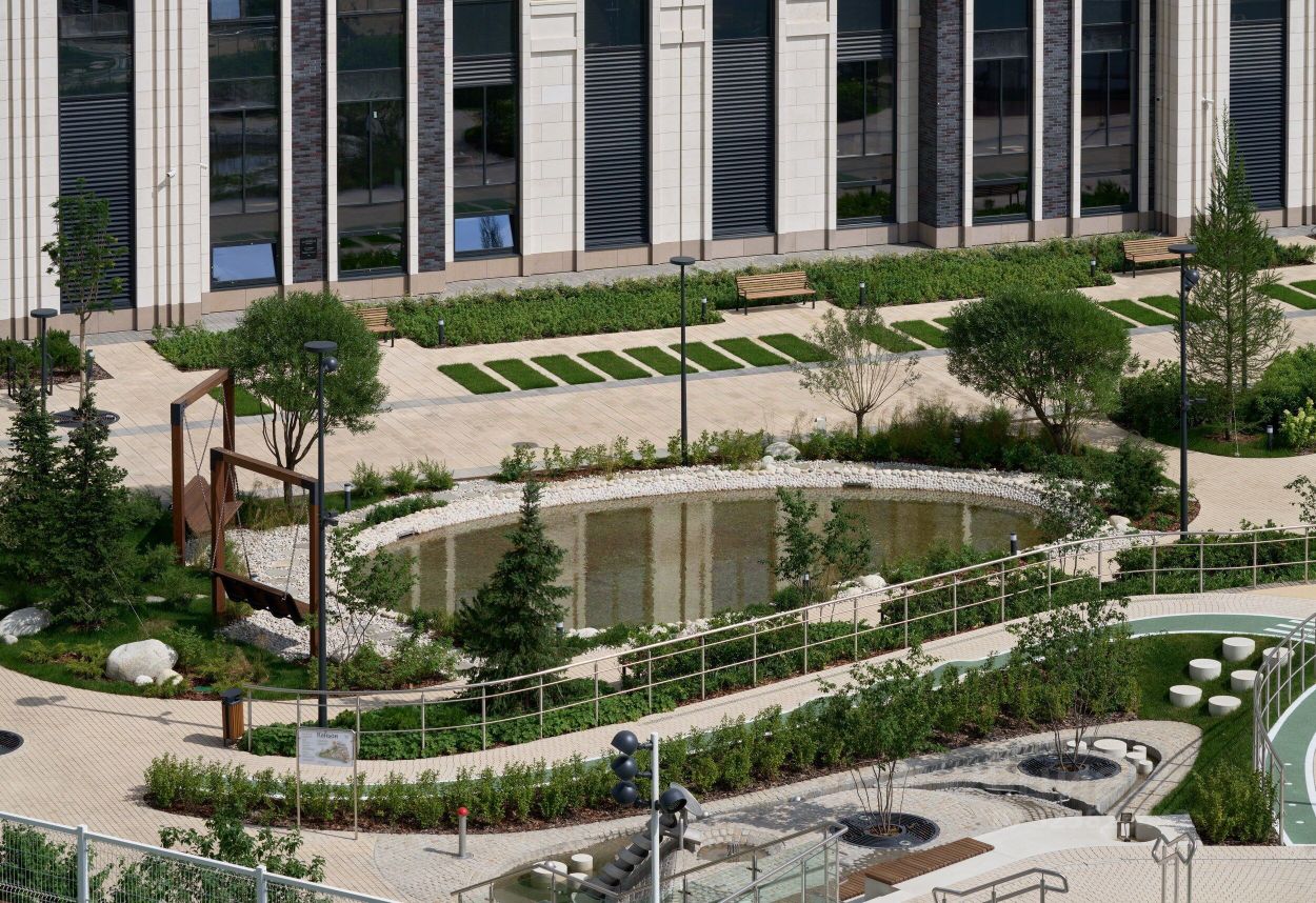 В центральной части парка расположен амфитеатр со сценой для представлений и проведения мероприятий. Для гармоничного развития маленьких жителей - пространства по стандарту Kid's Lab для гармоничного развития детей всех возрастов: детская площадка, игровая комната, рельефная площадка для общения со сверстниками, где можно заниматься паркуром, танцевать и играть в настольный теннис.