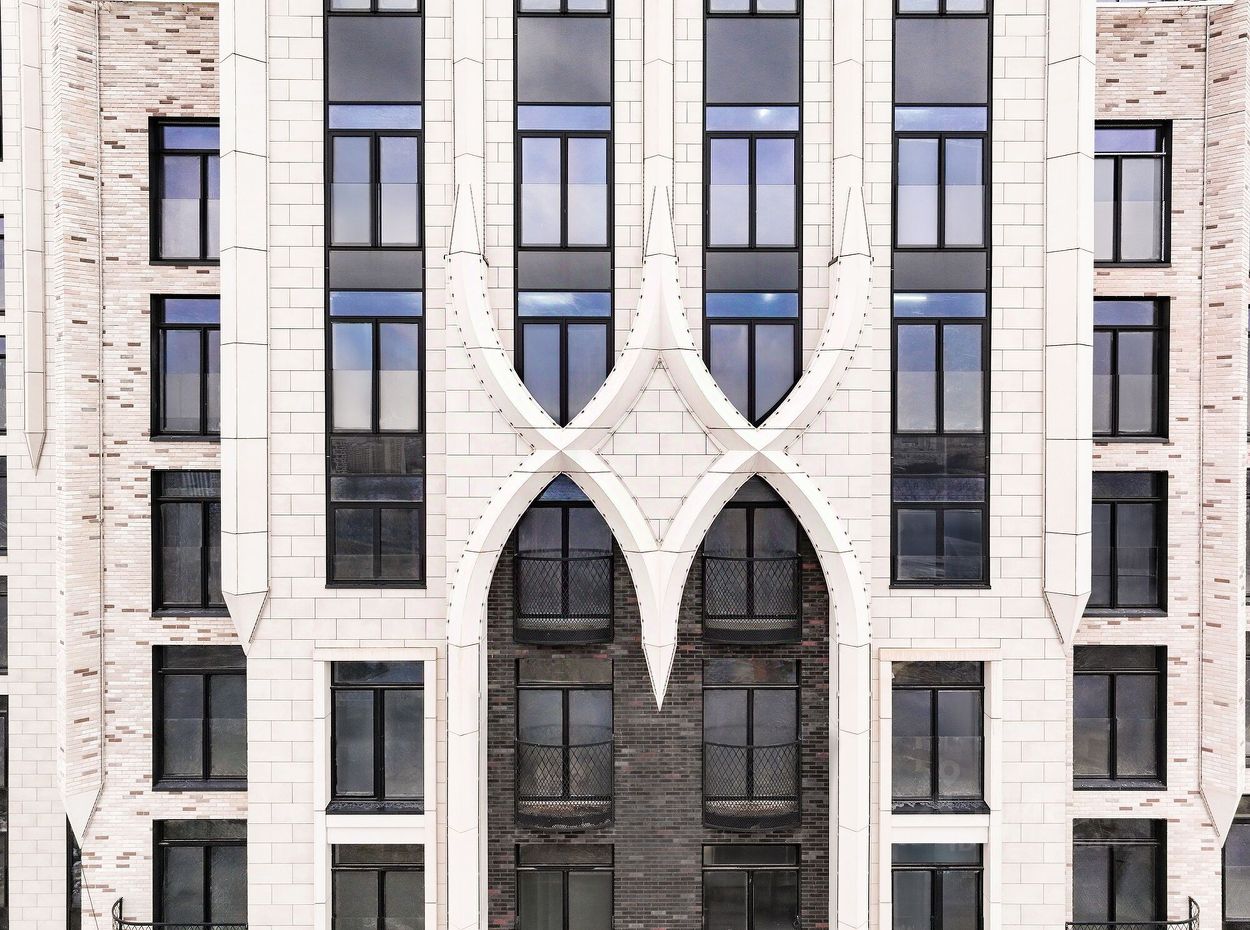 Архитектура проекта - современное прочтение торжественного и изящного стиля ар-деко, который, как и сталинский ампир, сформировался в результате развития идей чикагской школы. В доме 6 секций, 115 вариантов продуманных планировочных решений - от уютных студий до просторных пентхаусов с дровяным камином. В каждой квартире предусмотрен полный комплекс систем комфорта: принудительная центральная вентиляция с фильтрацией воздуха, очистка воды до уровня питьевой, круглогодичное горячее водоснабжение, быстрые бесшумные лифты, которые идут прямо в паркинг, продуманная подготовка под кондиционирование и другие технологические решения.