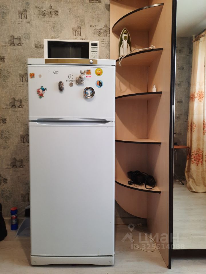 В комнате диван, шкаф, холодильник, микроволновая печь, есть столик, утюг