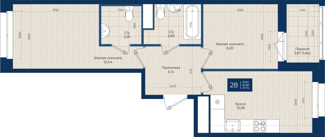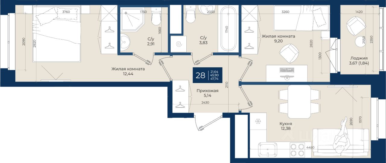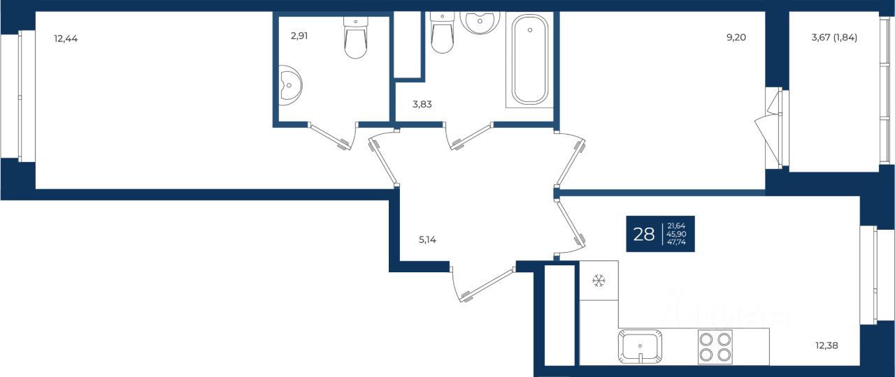 Жилой комплекс ''Новатория'', 1 очередь строительства, Корпус А, Квартира 28 общей площадью 47,74 м2 на 8 этаже.ЖК ''Новатория'' —жилой комплекс комфорт-класса расположен в поселке Новоселье, в окружении леса и Шунгеровского заказника.