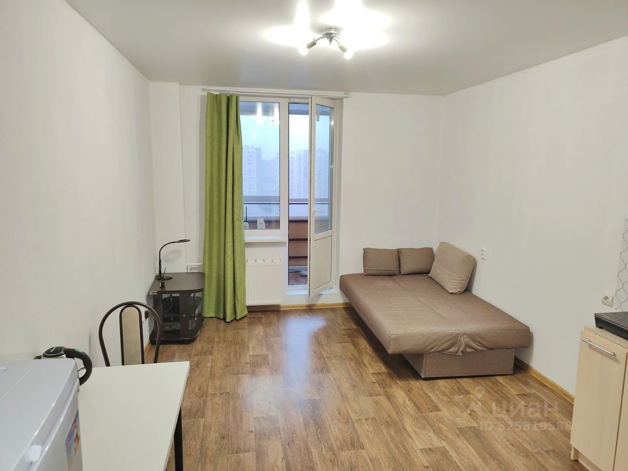 Общая площадь: студия с кухонной зоной. Ремонт: косметический Особенность: огромный балкон, с которого видно станцию метро Девяткино. Вся необходимая мебель:шкаф, диван-кровать, стол, стулья. Вся техника: холодильник, стиральная машина, индукционная варочная панель, микроволновка, мультиварка, чайник. Коммуникации: интернет можно подключить.