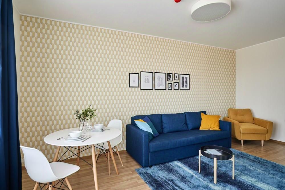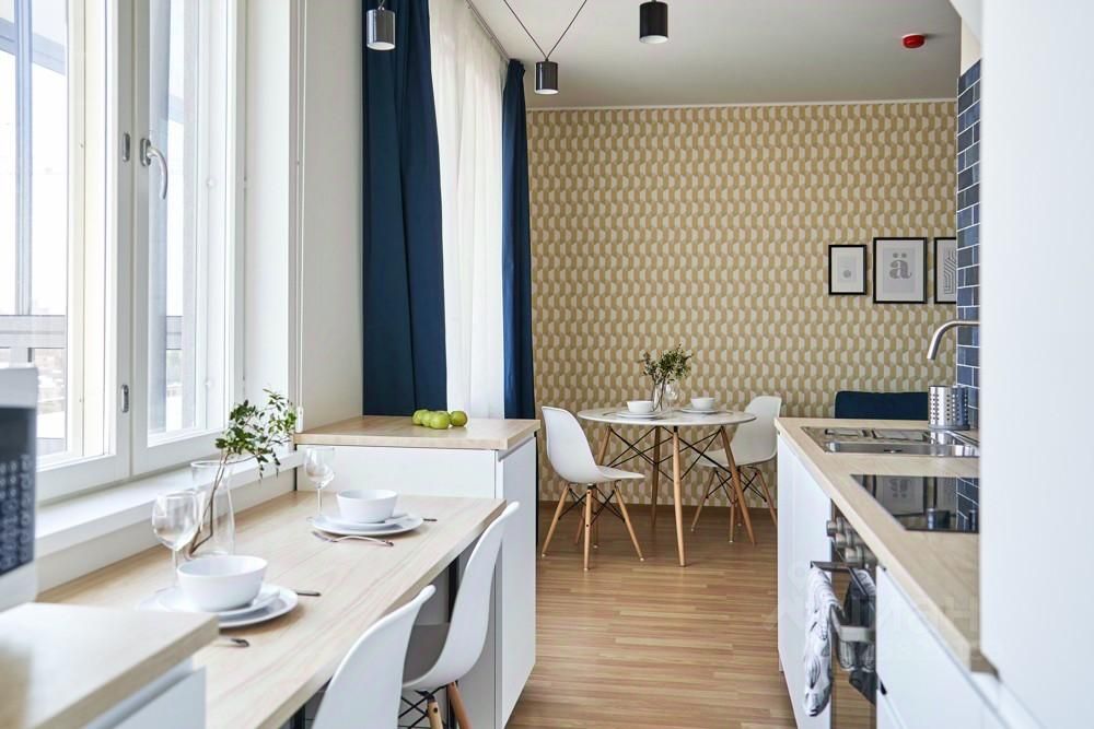 Стоит выглянуть из окна в спальне или выйти на балкон, и вся романтика старой Петроградки прямо-таки обрушивается на вас. Красный кирпич, шпиль Петропавловки вдалеке, гладь Большой Невки, зелень Ботанического сада и бескрайнее небо летнего Петербурга. Вдохновившись видом, дизайнеры Касабу повторили цвета и фактуры в интерьере. Кухонный фартук из блестящей ярко-синей, как невская вода, плитки. Акцентная стена в спальне цвета приглушенной зелени северного леса. Обои в гостиной, полностью повторяющие оттенки исторических домов. Квинтэссенция любви к месту и вдохновения своим городом.