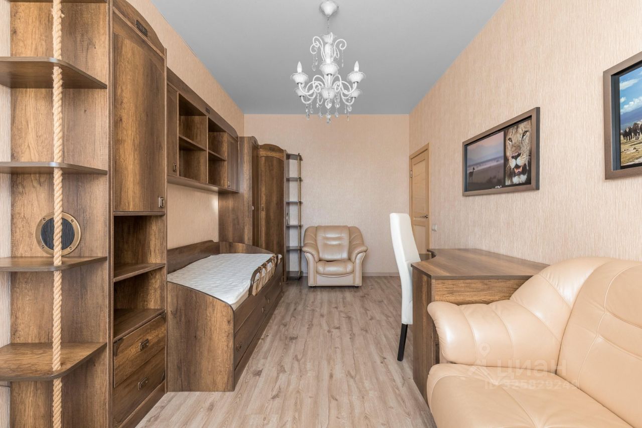 В квартире есть большая кухня - гостиная, спальня, детская комната и кабинет. Две лоджии. Два санузла.