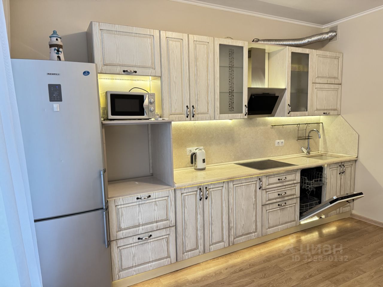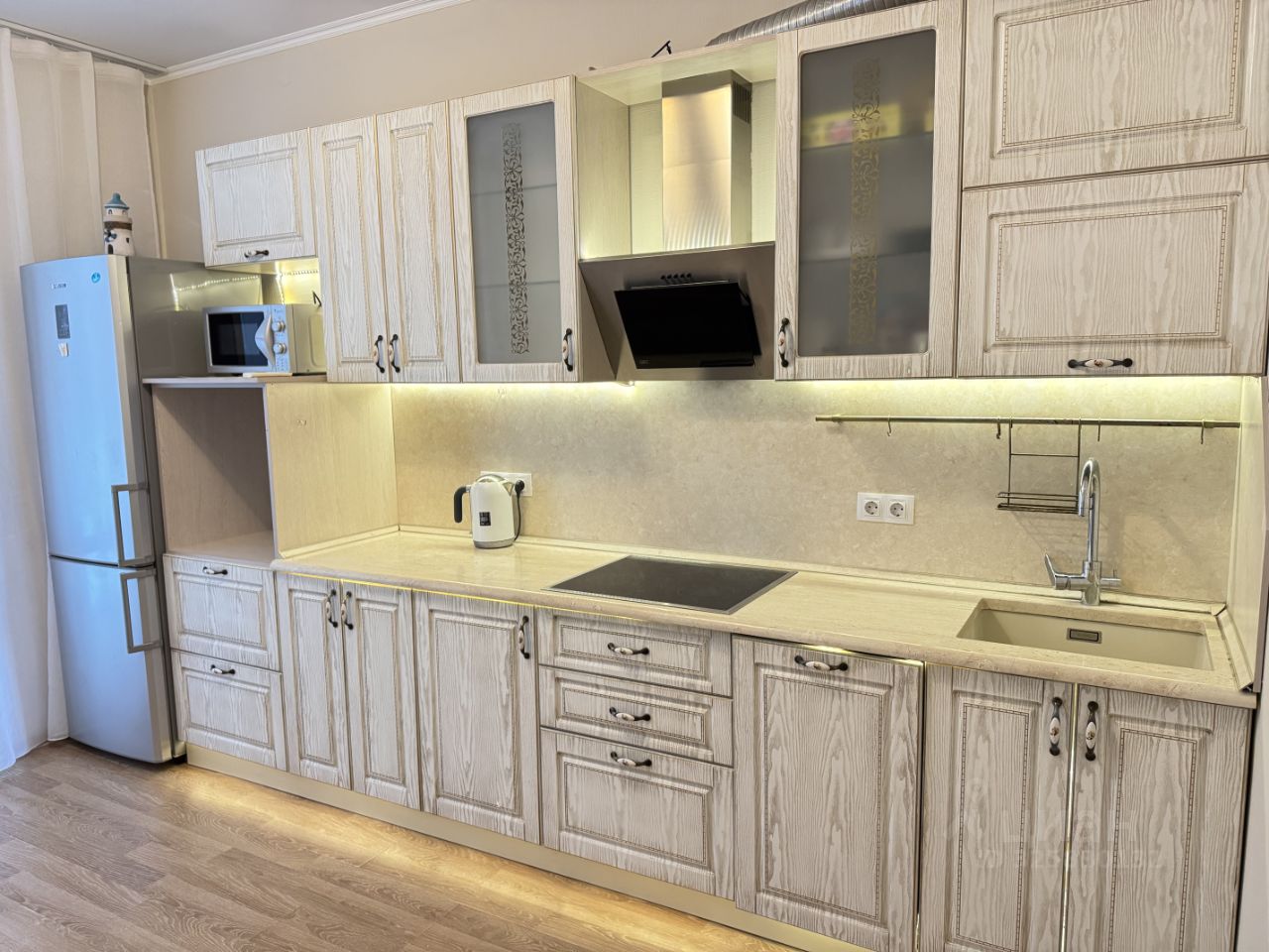 Стильная кухня: Современный гарнитур с практичной каменной столешницей. Техника Bosch (плита, посудомоечная машина), что гарантирует надежность. Также есть холодильник Samsung, микроволновка, чайник.