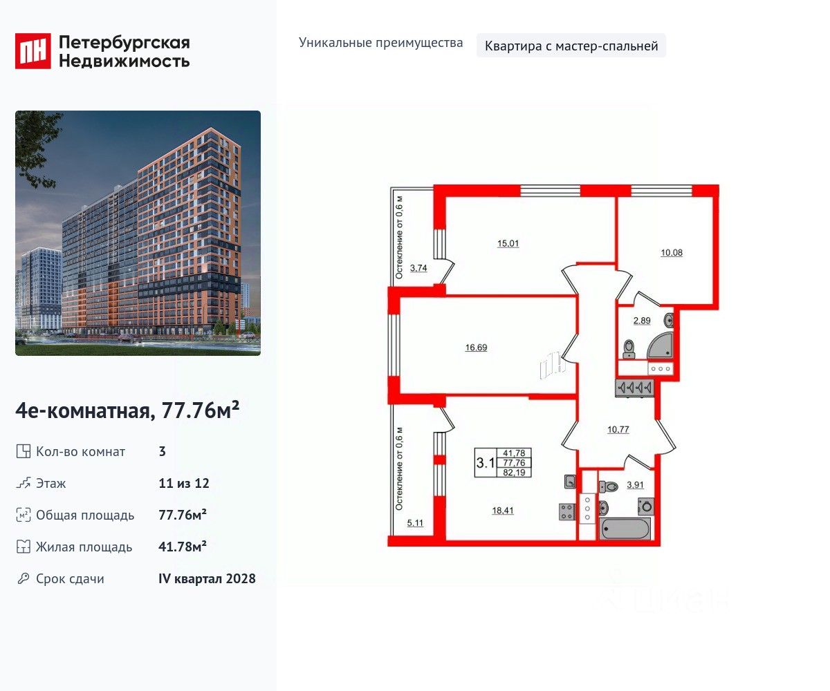 Уникальная, функциональная европланировка, большая кухня-гостиная 18.41 м², вместительная прихожая 10.77 м². Общая площадь квартиры - 77.76 м², жилая 41.78 м², высота потолка 2.77 м.