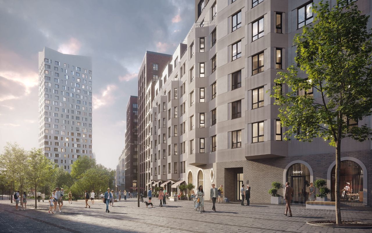 Здания комплекса примыкают друг другу торцами и создают единую архитектурную форму. Дома по обе стороны бульвара задают направление для прогулок, а волнообразный рисунок брусчатки и плавные изгибы делают бульвар похожим на русло реки. Каждый дом комплекса отличается от другого этажностью, формой, цветом, геометрией фасада.