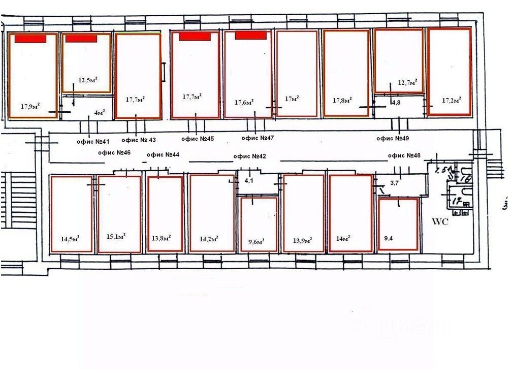 Помещение располагается на 4-м этаже пятиэтажного здания, кабинетная планировка с общим коридором