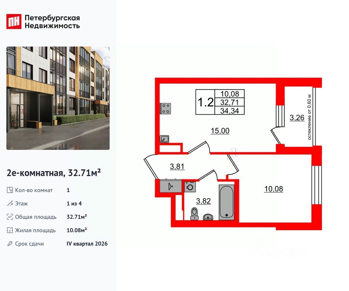 Удобная, классическая, функциональная европланировка, большая кухня-гостиная 15 м², вместительная прихожая 3.81 м². Общая площадь квартиры - 32.71 м², жилая 10.08 м², высота потолка 2.77 м.