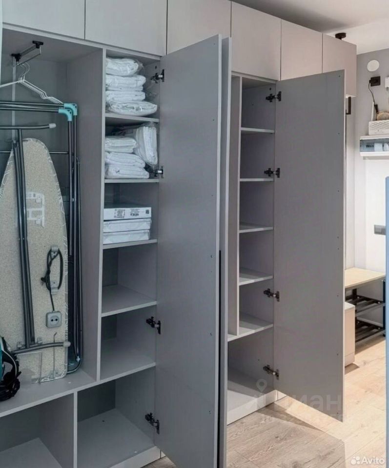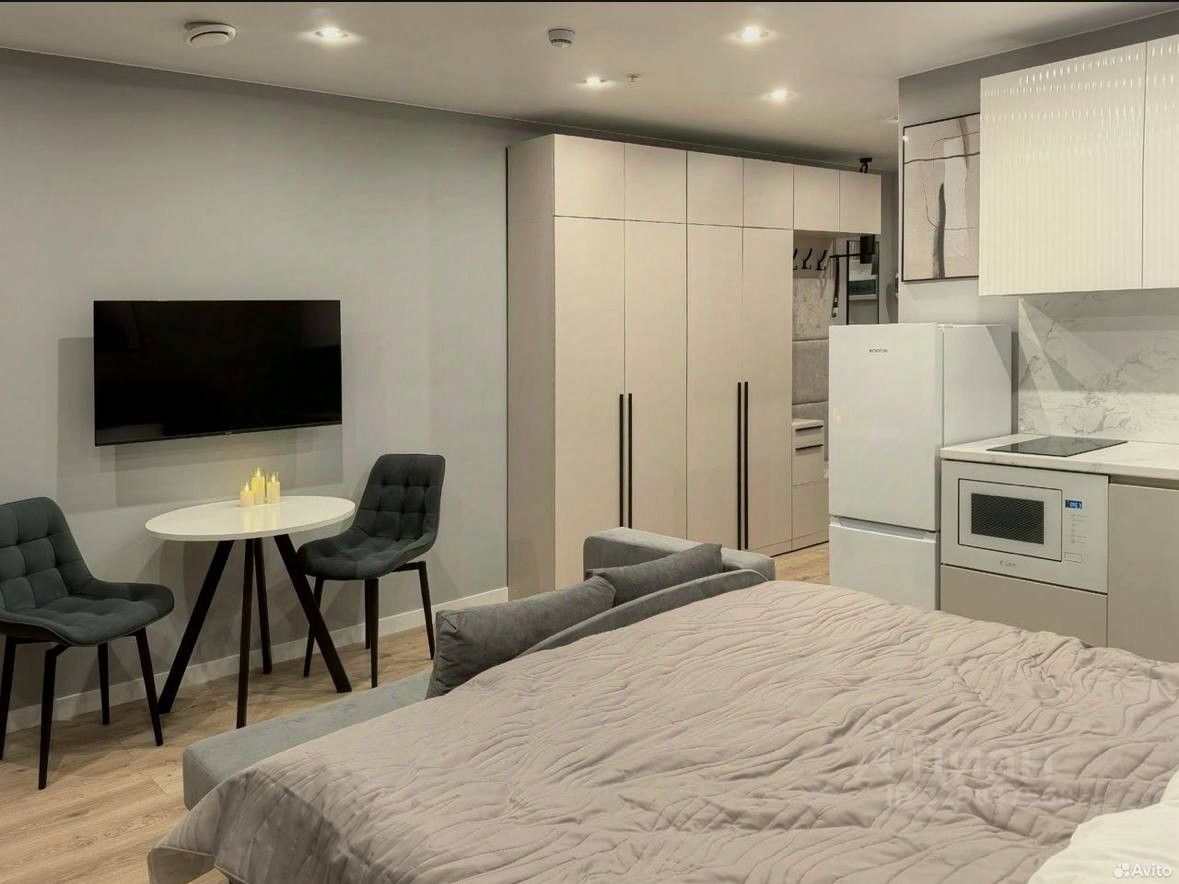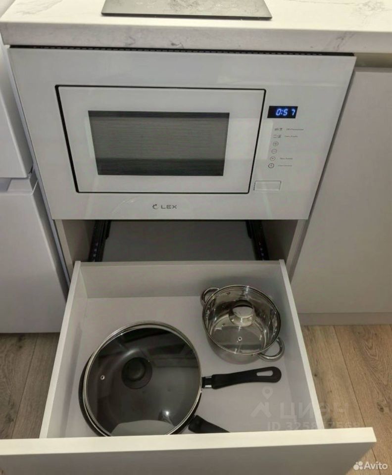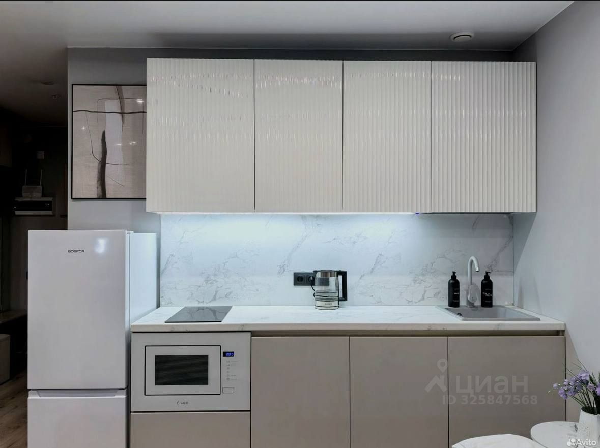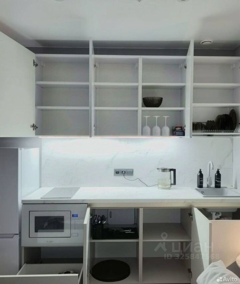 Встроенный кухонный гарнитур. Есть варочная панель, микроволновка, холодильник.