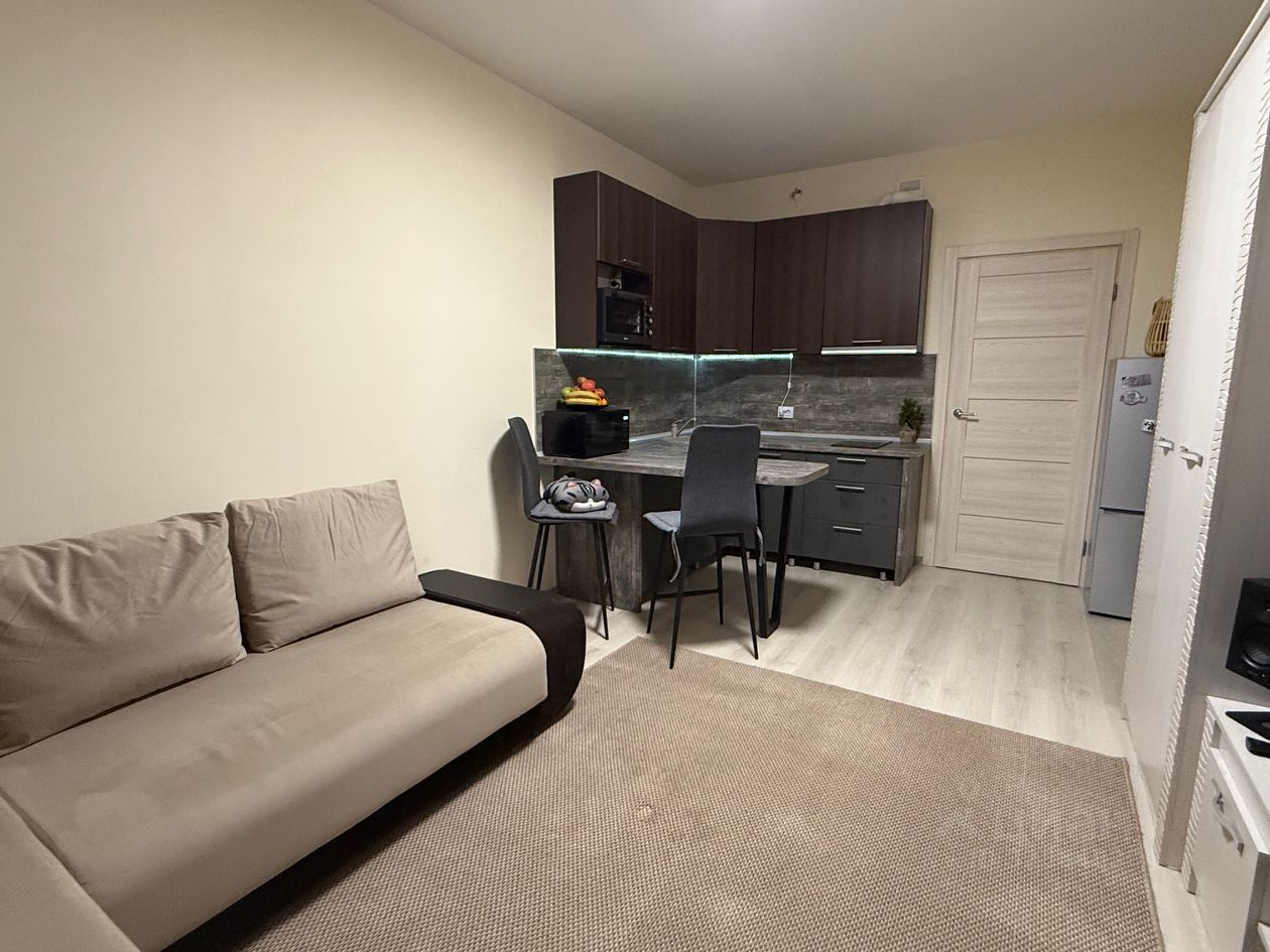 Общая площадь: 24 м², 3-й этаж. Состояние: светлая отделка под ключ. Заезжайте и живите! Полная комплектация: Вся необходимая мебель и техника остаются — большой диван, современная система хранения, оборудованная кухня, холодильник, стиральная машина в санузле. Комфорт: В санузле — теплые полы, в квартире продумано множество мест для хранения.