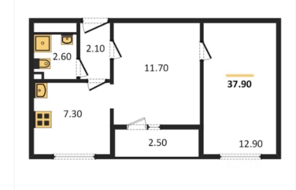 Общая площадь 37 м2, комнаты 11.7+12.9 кв.м., кухня-8 кв.м. Комнаты смежные.