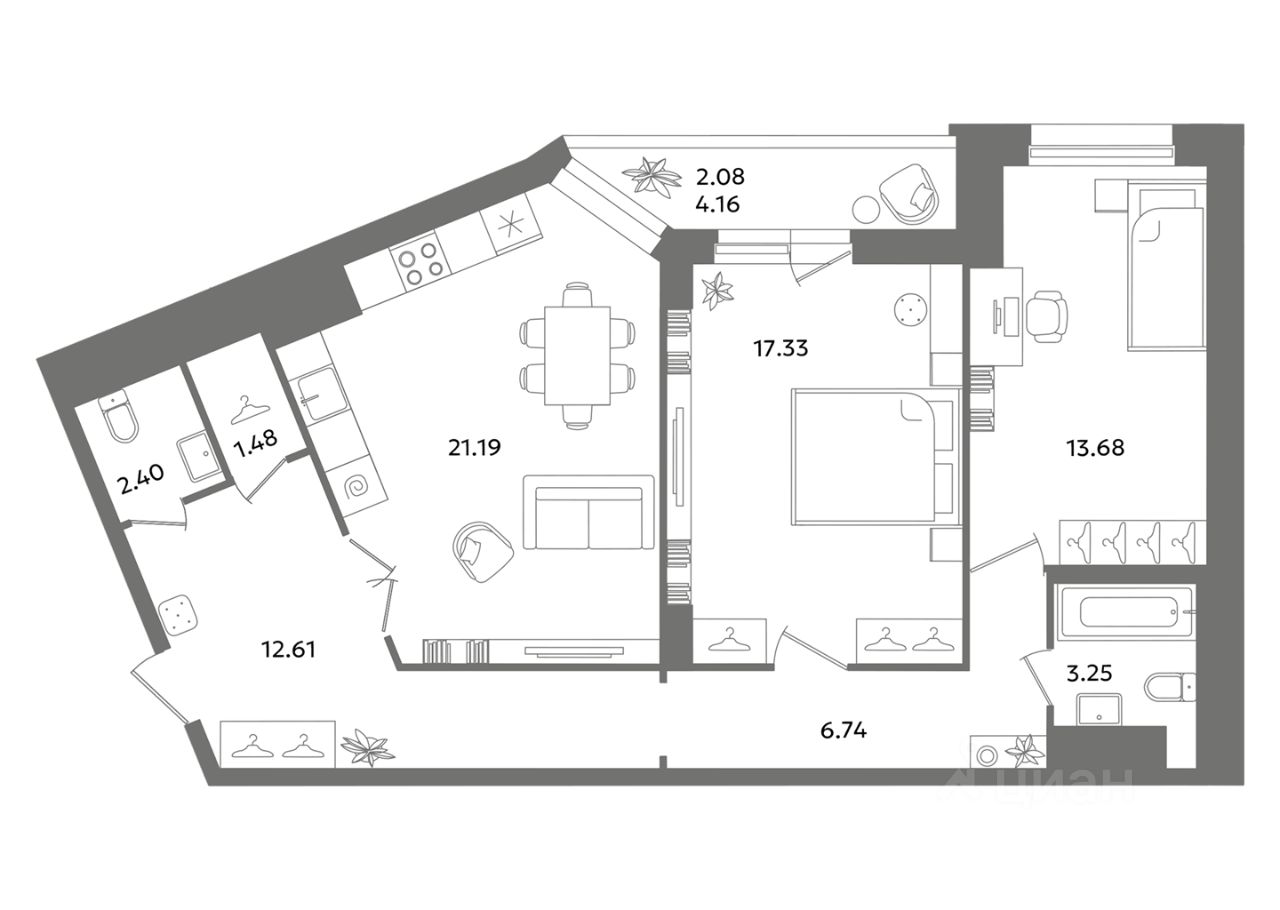 Большая кухня-гостиная 21.2 кв.м. станет любимом местом для отдыха всей семьи и приёма гостей. Жилые комнаты: 17.3 кв.м. с выходом на лоджию и 13.7 кв.м. Остекленная лоджия 4.2 кв.м. станет дополнительным пространством для работы, учёбы или отдыха. Прихожая 19.4 кв.м. с местом под большой шкаф и гардеробной 1.5 кв.м. Два санузла. Вид во двор. Этаж 22.