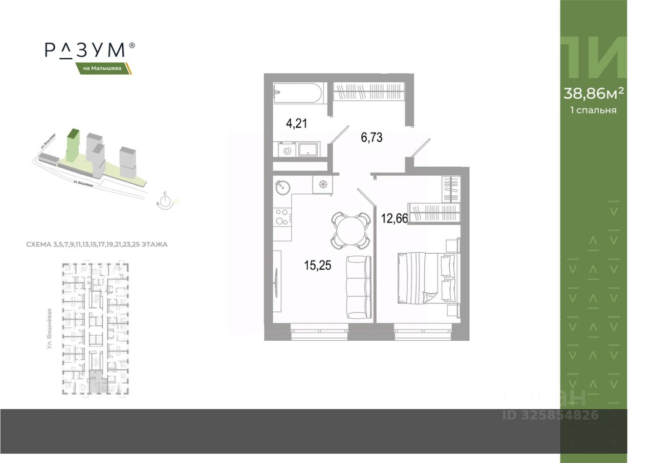 ''РАЗУМ на Малышева'' — это четыре 31-этажных башен на улице Малышева. Дополнительная приватность, безопасность и тишина создаётся за счёт возвышения домов на стилобате. Балконы на фасадах открывают виды на город и во двор, а угловые террасы открывают ещё больше простора и потрясающих видов. Жители квартала ''РАЗУМ на Малышева'' наслаждаются зелёными зонами круглый год. 60% территории занимает озеленение с деревьями, кустарниками и многолетниками.