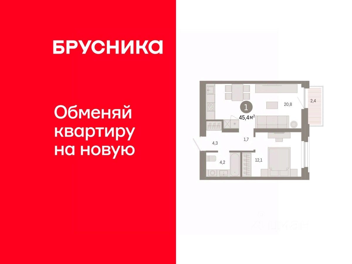 Квартира с кухней-гостиной и одной спальней в жилом районе ''Зарека''. Особенности планировки: балкон, предчистовая отделка. квартиры в нашей базе: ЗРК05.2-Ж4.5.4.