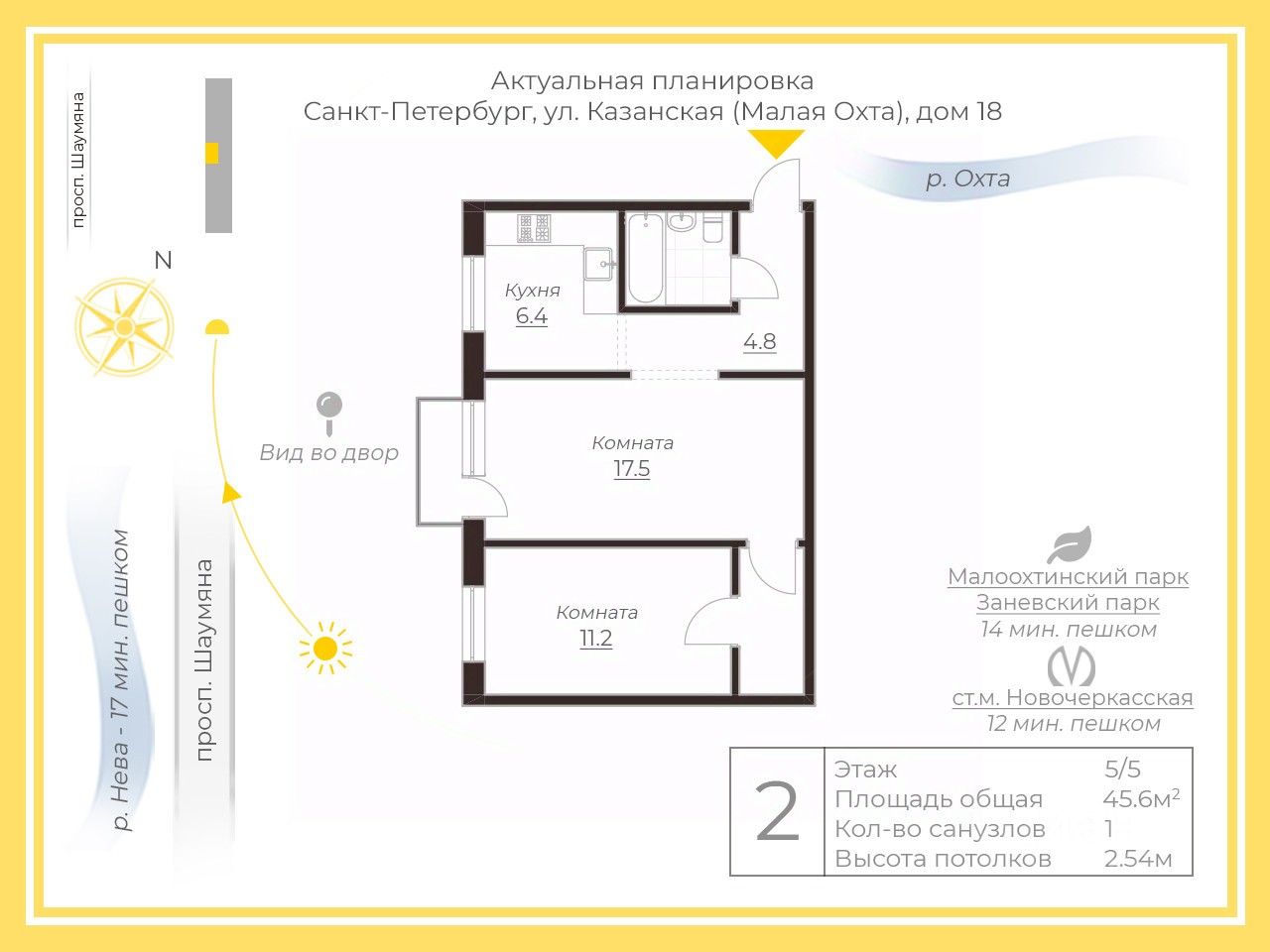 Арт. 69645510 Компактная 2-комнатная квартира с окнами в зеленый двор в 12 минутах от станции метро ''Новочеркасская'' . Квартира расположена на 5-м этаже 5-ти этажного панельного дома 1960 г.п. Общая площадь составляет 45,6 кв.м., не включает площадь лоджии.