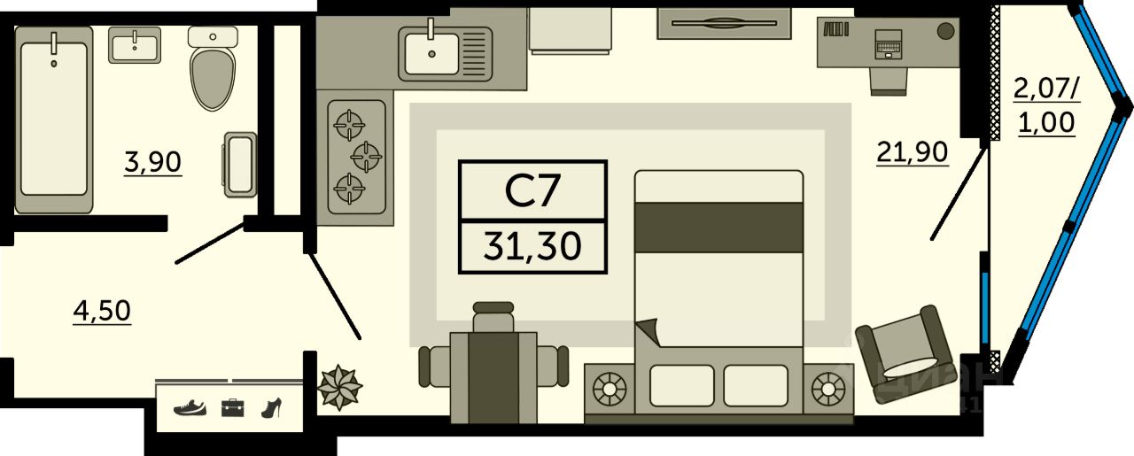 В продаже квартира-студия в новостройке. Лучшее решение для молодой семьи, под сдачу или для инвестиций. Это современный вариант просторной студии с полноценной прихожей. Благодаря продуманному зонированию при входе достаточно места для кухонной зоны или для хранения вещей. Успейте забронировать квартиру мечты напрямую от застройщика.