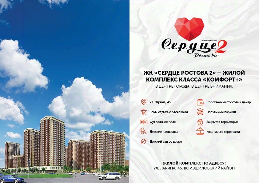 Жилой комплекс ''Сердце Ростова 2'', предлагающий уникальный формат квартир с террасами и объединяющий всё необходимое для комфорта городской жизни. Включает девять многоэтажных домов, ТРЦ и детский сад. Расположен в Ворошиловском районе, по адресу, ул. Ларина, 45. - Монолитно-каркасная технология строительства. -Облицовка кирпич в соответствии с ГОСТом - Срок ввода в эксплуатацию III квартал 2025 года. - 9 литеров по 26 этажей. - 10 минут до центра города. - ТОПЖК: 2 место в номинации ''ЛучшийЖК в Ростовской области''. - Рядом ТЦ ''Горизонт'', вЖК собственный ТЦ. - В наличии квартиры с террасами. - Закрытая территория, собственный детсад. - Продуманные зоны отдыха вЖК. - Рядом 10 школ, 12 детсадов, 2 вуза.