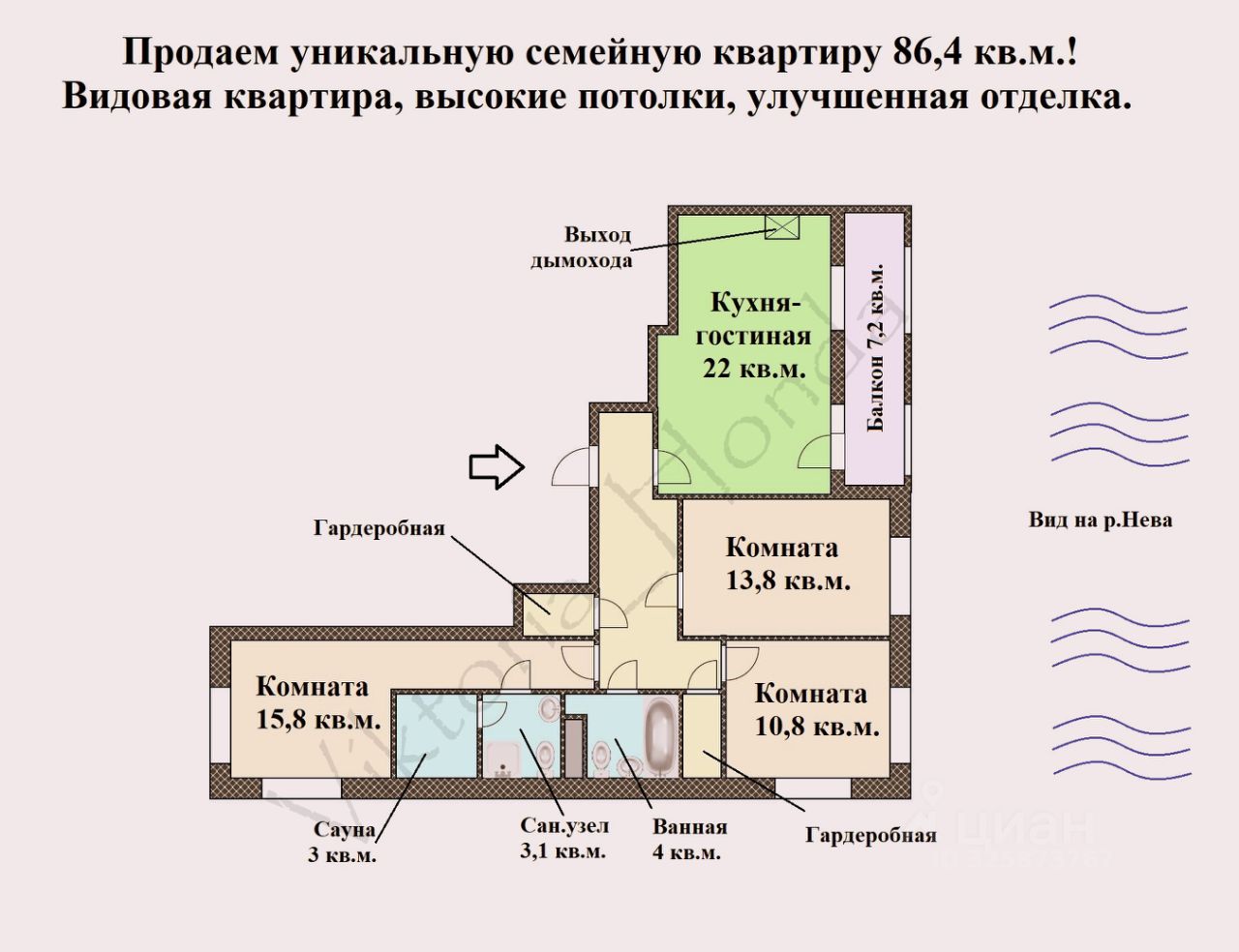 О квартире. + Уникальная квартира выводили в продажу под нас: большая кухня гостиная с выходом дымохода для установки камина, изолированные спальни, зоны гардеробных, светлые комнаты с двумя окнами, высокие потолки, выделенное помещение под сауну лучшее предложение на рынке. + Улучшенная отделка: сан.узлы выполнены в керамограните под потолок, установлена качественная фурнитура (розетки, ручки), в сан.узлах - система теплых полов. + Большеформатные окна нашей квартиры выполнены из облегченного алюминиевого профиля и соответствуют высоте потолков (такой формат окон только на 12 этажах). + Кухня-гостиная 22 кв.м. с панорамными окнами в пол создают особую атмосферу, а наличие дымохода воплотит мечты о настоящем камине. + Кухня-гостиная с видом на р. Нева это приятный морской Питерский близ, вдохновляющие рассветы и впечатляющие виды на город. + Комната 13,8 кв.м. привычной прямоугольной планировки, но благодаря большеформатному окну и видовым характеристикам комната становится особенной. + Комнаты 10,8 кв.м. и 15,8 кв.м. благодаря наличию двух окон, максимально насыщенны солнечным светом, что так ценно в сером Петербурге. + В квартире отлично спланировано пространство: выделено два помещения под гардеробные, есть ниши под установку систем хранения. + Два раздельных сан.узла, с помещением под сауну (предустановлено термостойкое стекло), либо же данное пространство отлично подойдет под постирочную зону. + На этаже всего 5 квартир, что также сказывается на комфорте жизни. + Для жителей есть удобная система хранения автомобилей - подземный паркинг, куда вы сможете спустить в домашних тапочках - доступ прямиком из парадной. + Территория жилого комплекса закрыта от посторонних, есть зона лобби для проведения переговоров. + По истине уникальный дом вы находитесь в эпицентре событий и мест, при этом камерность и комфорт проживания стоит на первом месте.