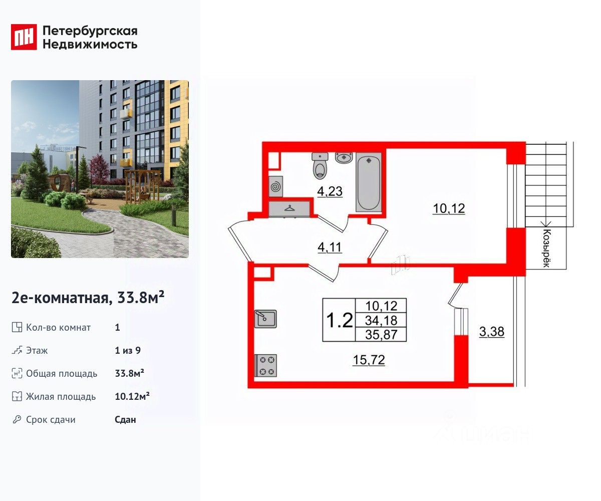 Удобная, классическая, функциональная европланировка, большая кухня-гостиная 15.62 м², просторная прихожая 4.11 м². Общая площадь квартиры - 33.8 м², жилая 10.12 м², высота потолка 2.77 м.