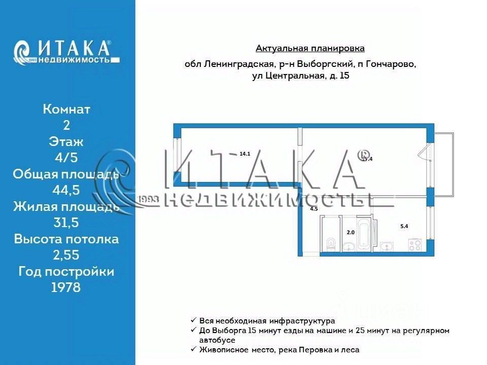 128654532 Продаётся уютная двухкомнатная квартира площадью 44.5 квадратных метров на четвёртом этаже пятиэтажного панельного дома, расположенного в спокойном районе поселка Гончарово. Рассмотрим варианты обмена на город Выборг.