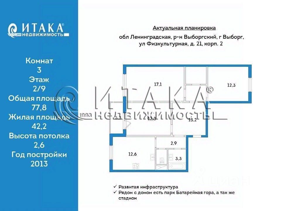 128654274 Продаётся уютная трехкомнатная квартира площадью 77.8 квадратных метров на втором этаже девятиэтажного панельного дома, расположенного по адресу: г.Выборг, Центральный микрорайон, ул.Физкультурная, дом 21 к2. Строение 2013 года обладает современной инфраструктурой: в шаговой доступности находятся школа, детский сад, торговый центр, парк и фитнес-клуб.