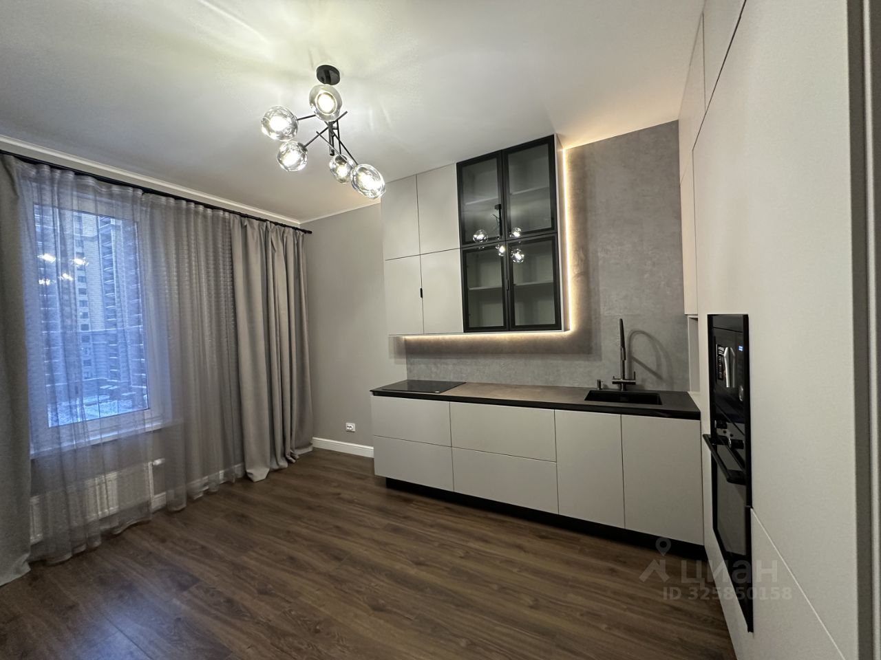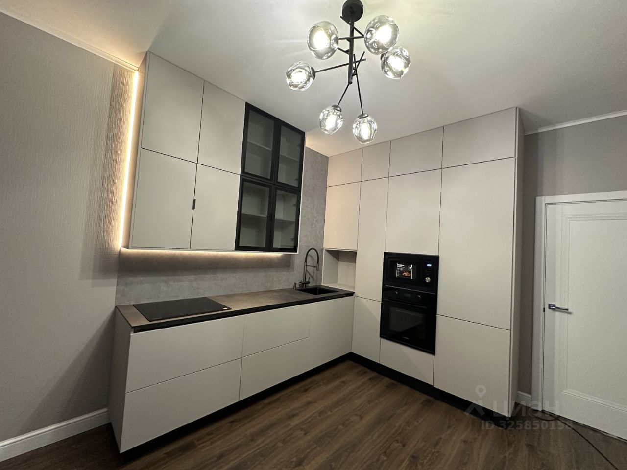 Кухня оснащена современной техникой, включая холодильник, микроволновую печь, чайник, духовой шкаф и варочную панель.