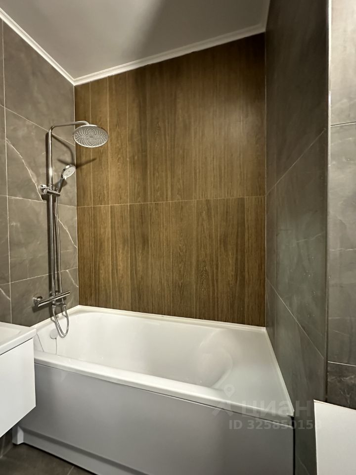 Санузел совмещенный, оформлен стильной плиткой и оснащен ванной.