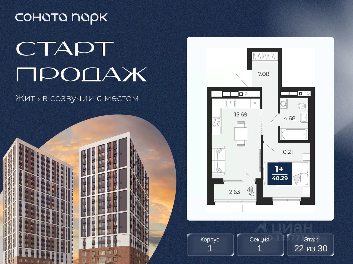 Однокомнатная квартира с предчистовой отделкой в ЖК ''Соната Парк'' на 22 этаже. Общая площадь: 38.98 кв.м., жилая: 10.21 кв.м., площадь просторной кухни-столовой: 15.69 кв.м. Все окна выходят на одну сторону. В квартире одна лоджия, один совмещенный санузел. Высота потолков 2.72 м.